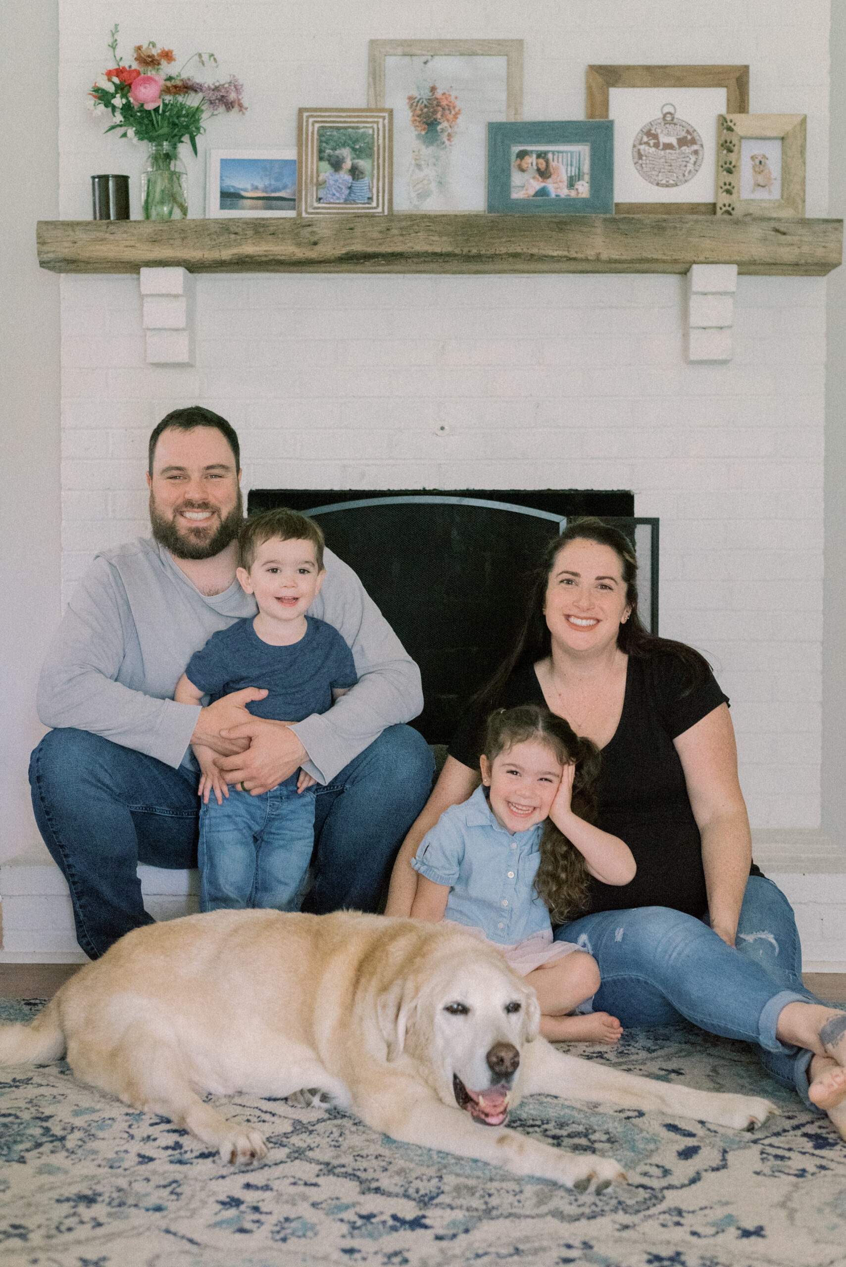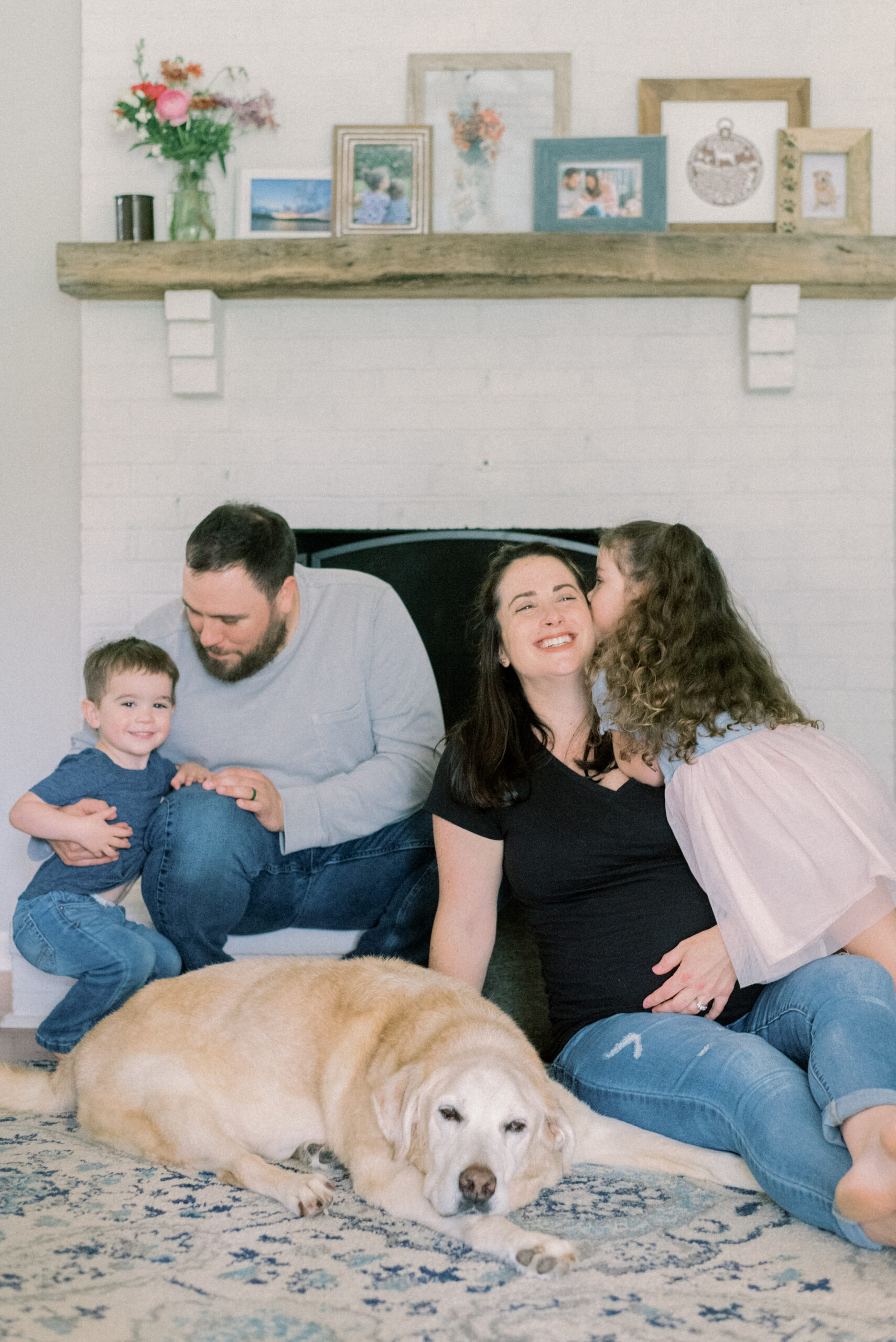 The session was simple. No fancy wardrobe changes. No elaborate styling. Just love and light and presence. We moved slowly, taking our time to soak in the weight of the moment. Nugget, though slowing down, curled up close to Sam’s belly as if he knew there was a new heartbeat in the room. The kids played and snuggled around their mama while Nugget rested nearby.