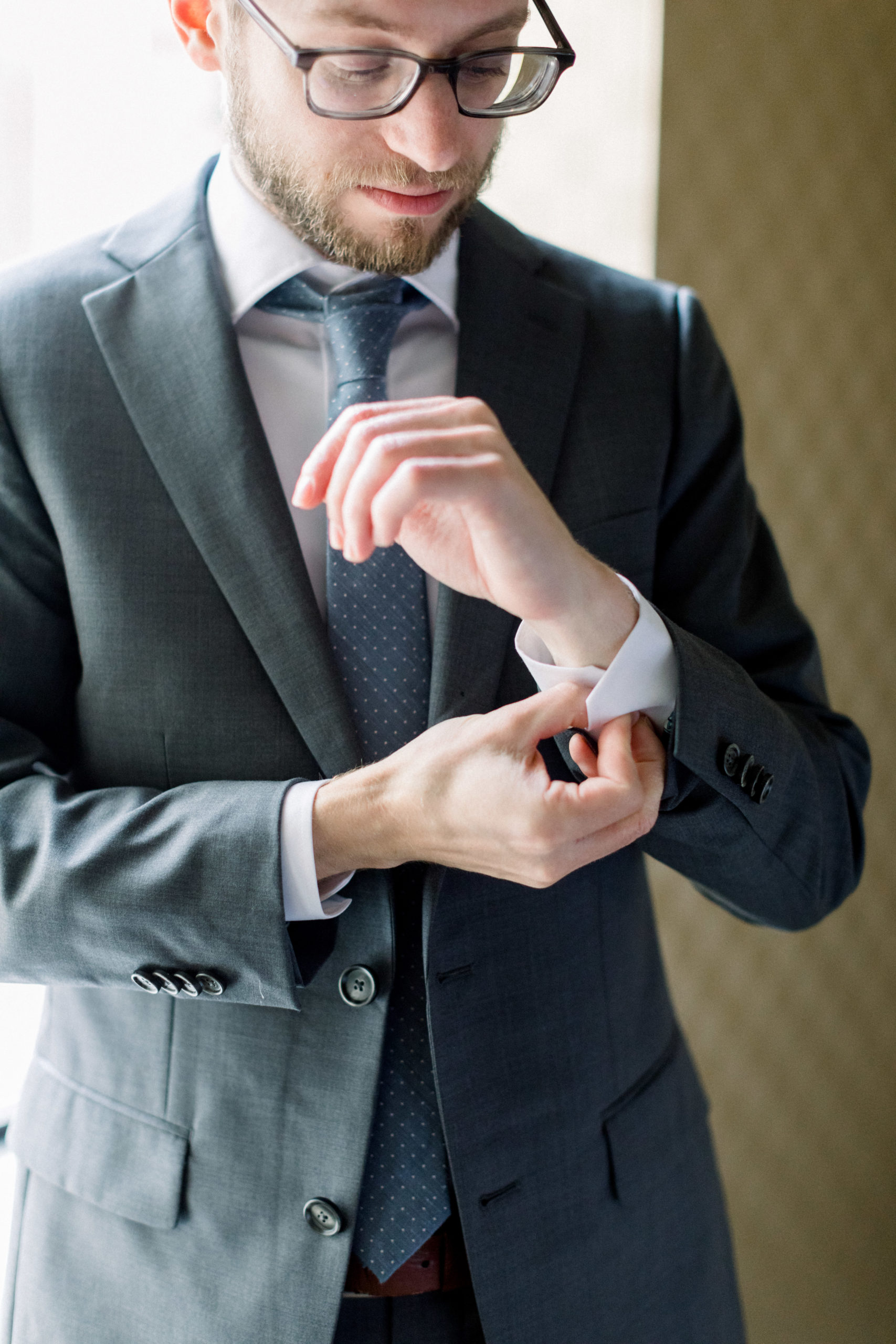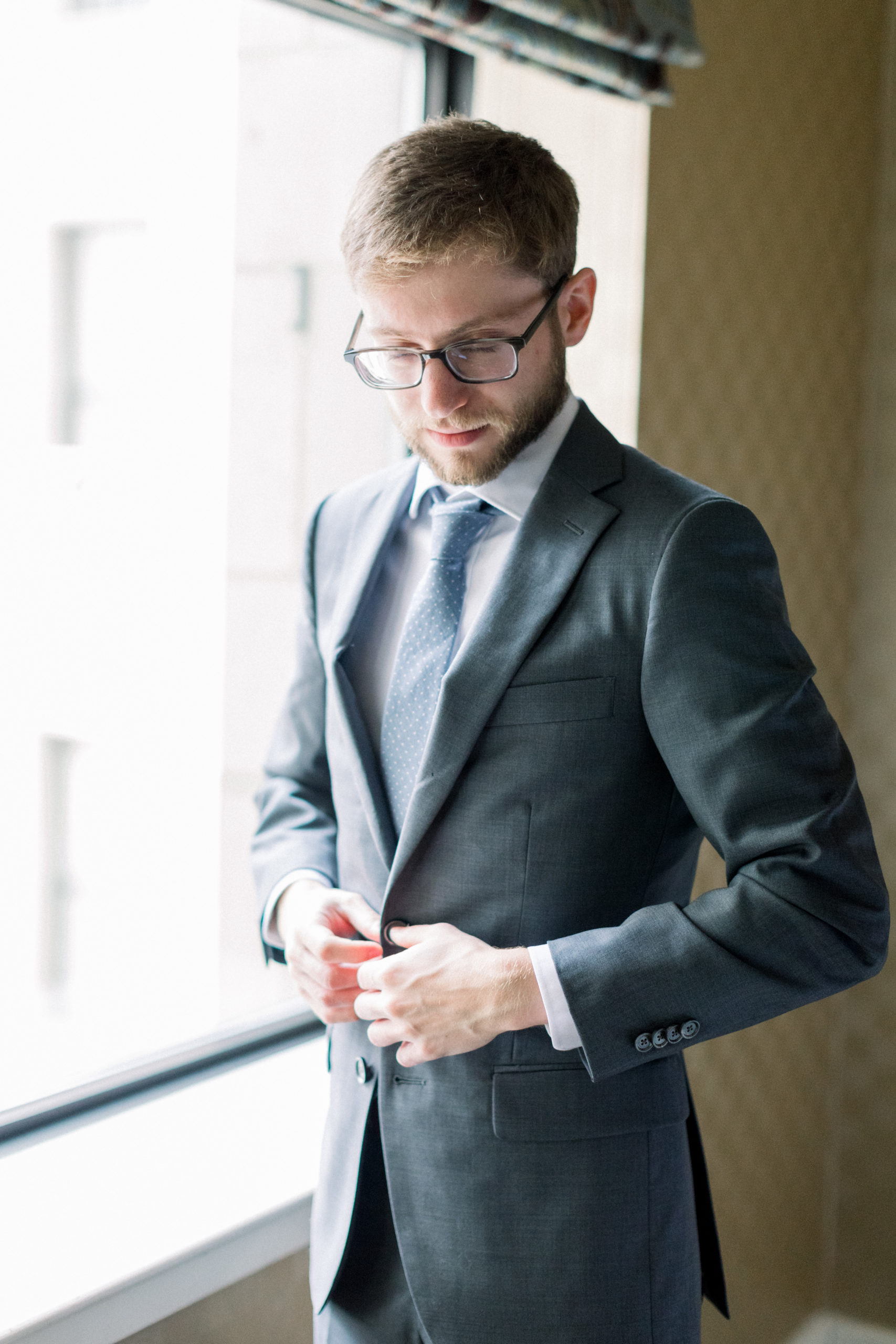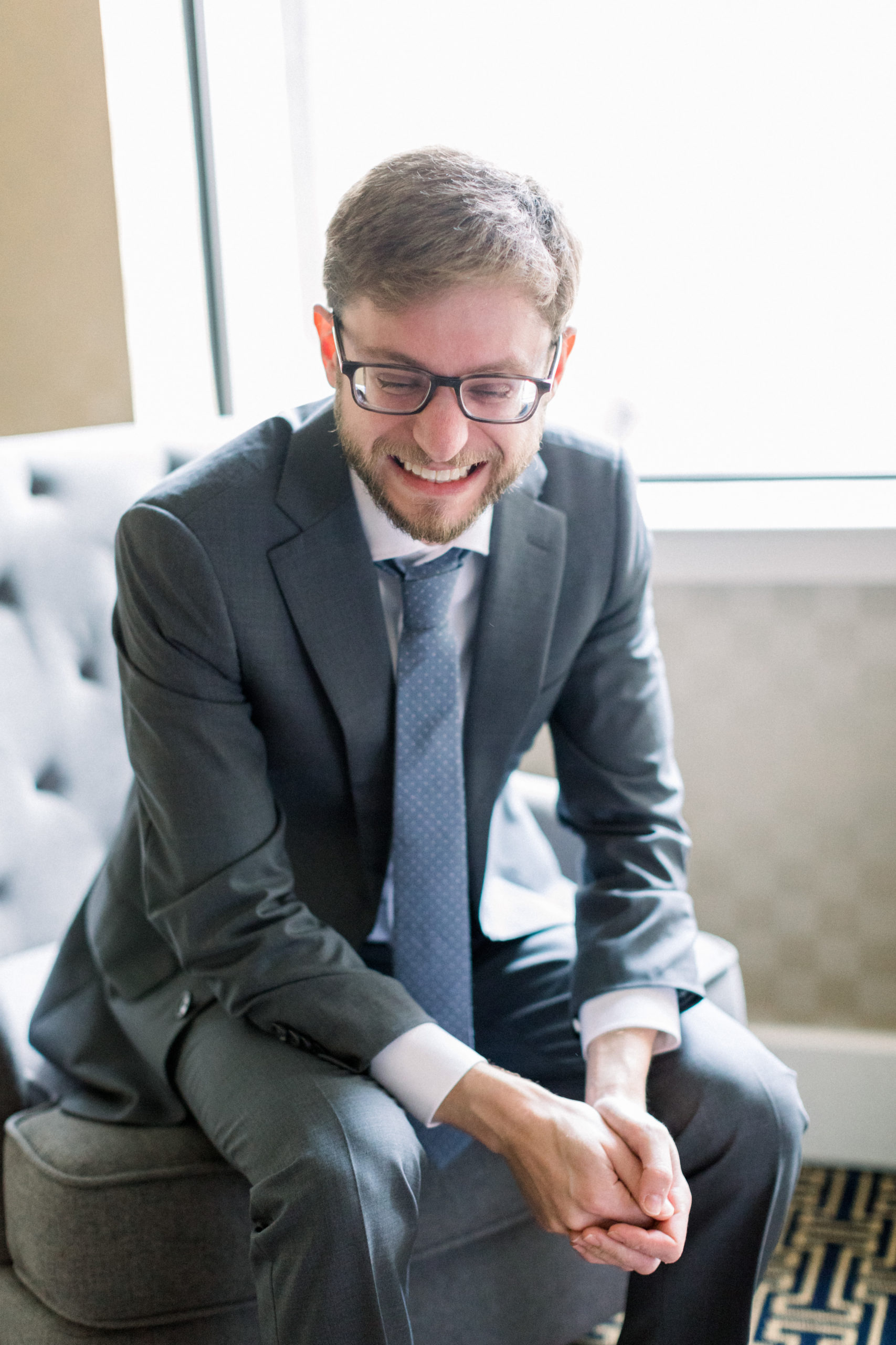 groom sitting on chair before elegantly Modern Accelerator Baltimore Wedding
