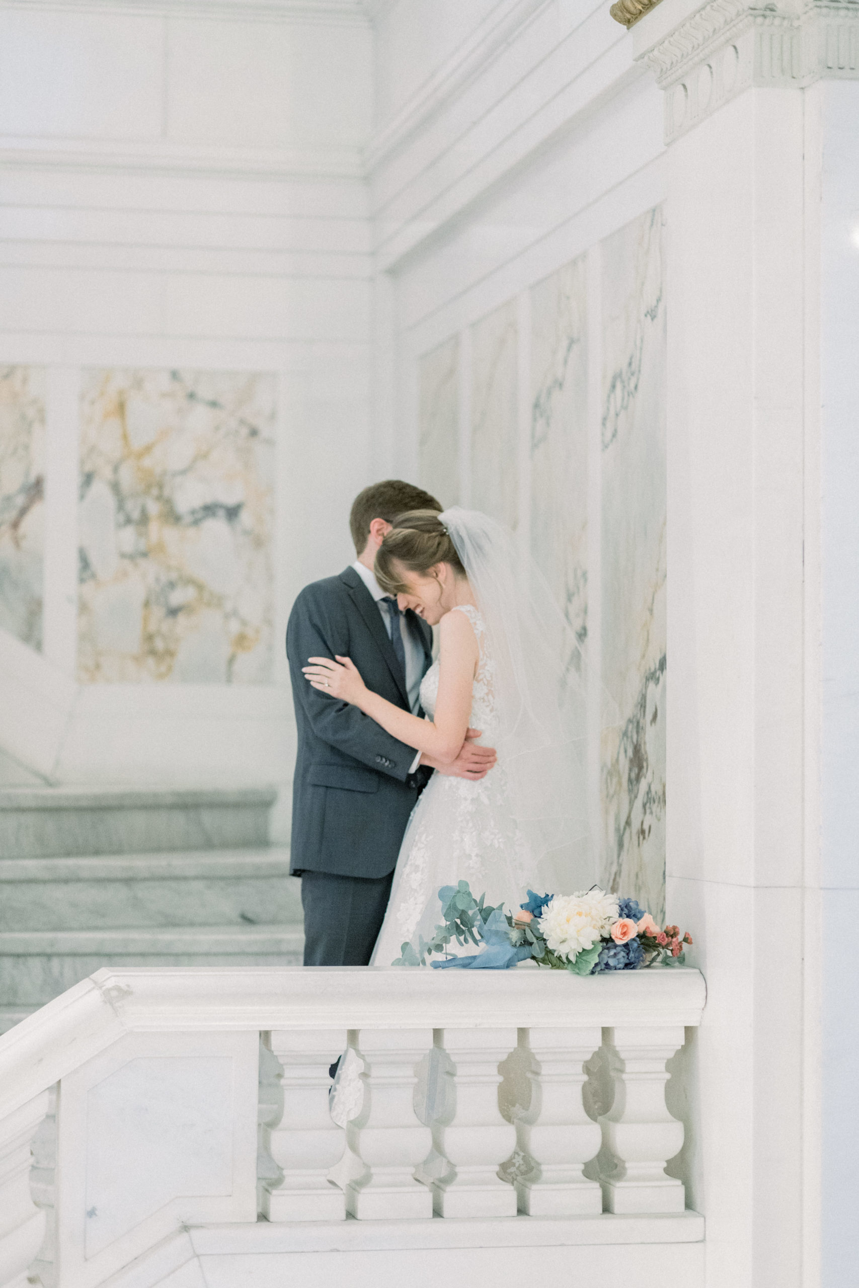 bride and groom embracing during first look before elegantly Modern Accelerator Baltimore Wedding