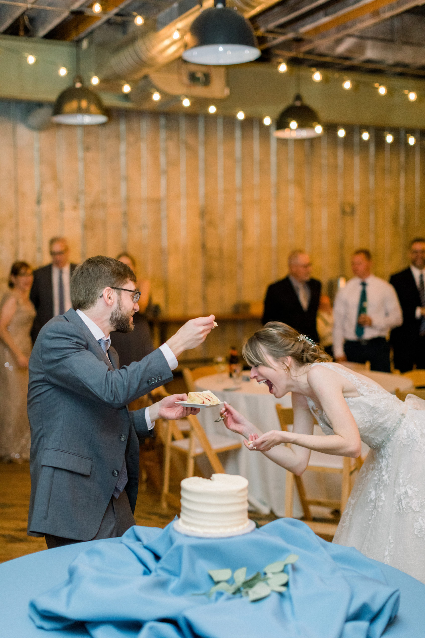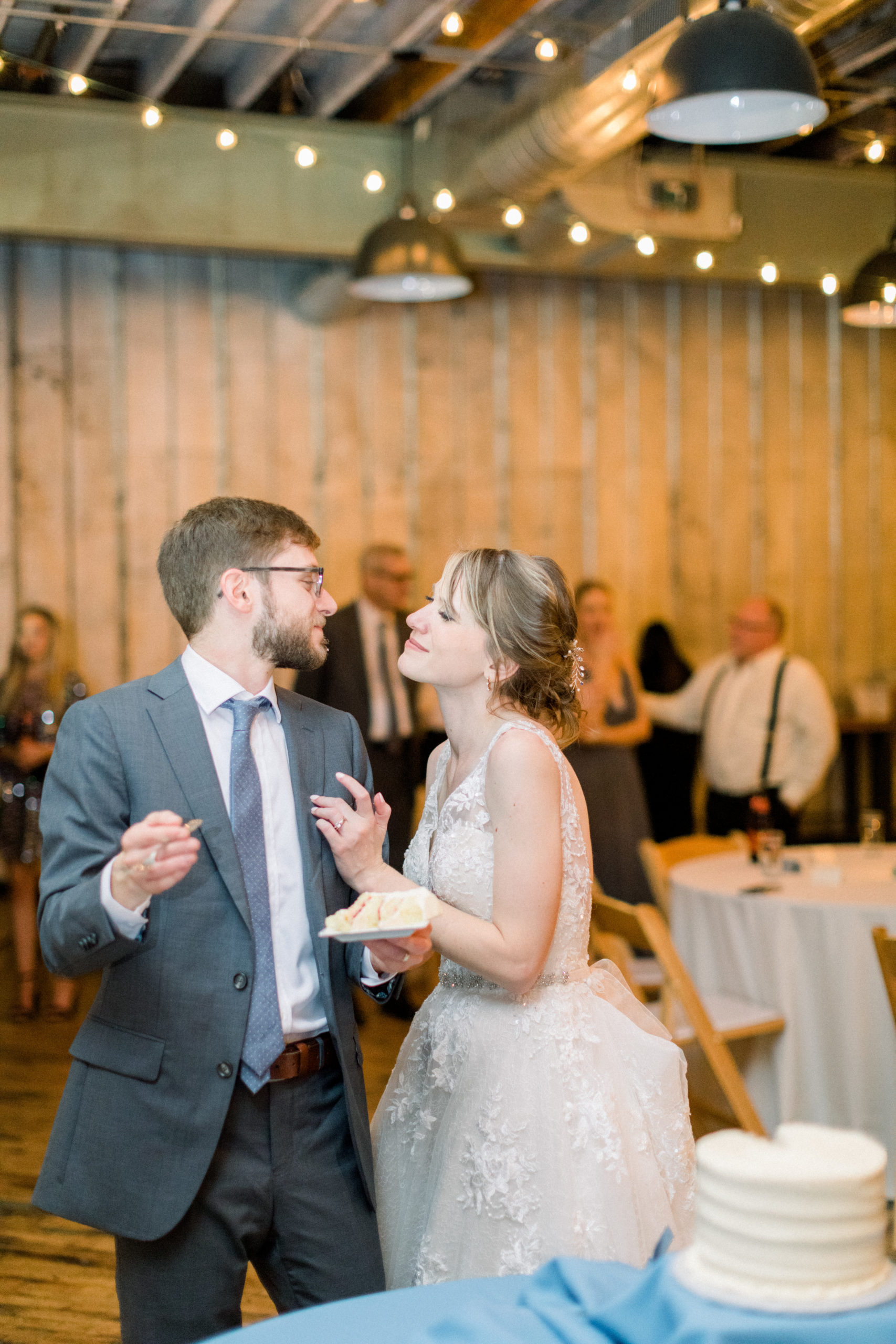 bride laughing as groom feeds her wedding cake at elegantly Modern Accelerator Baltimore Wedding