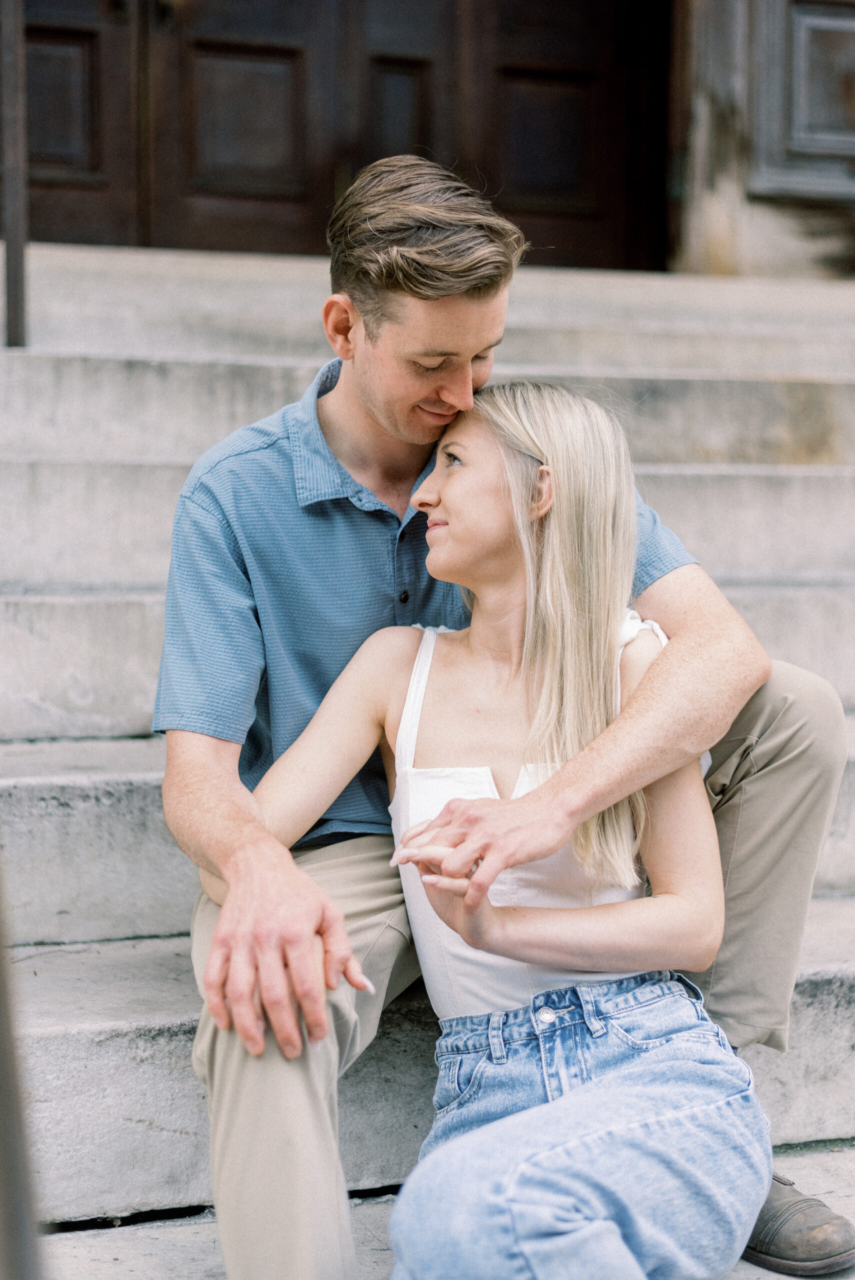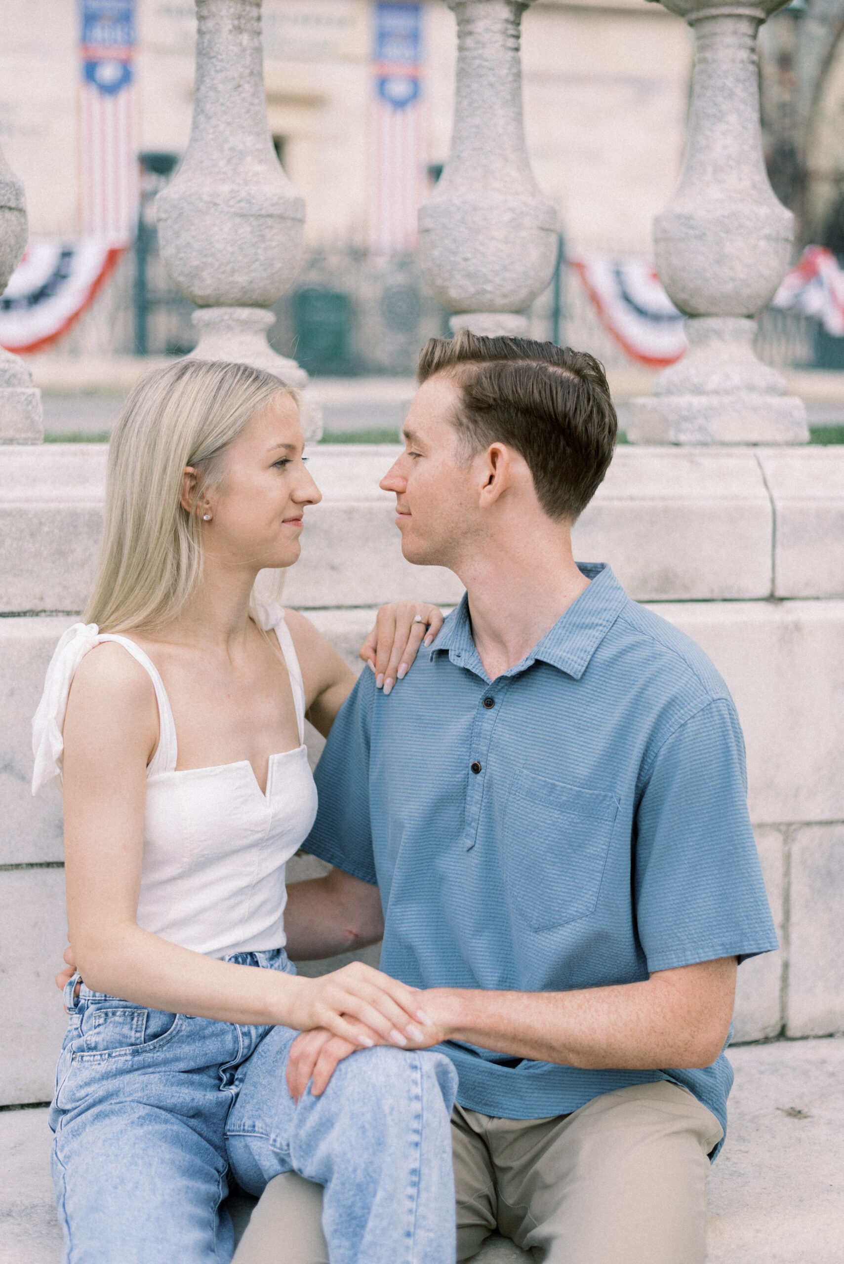 Their engagement session in Mt. Vernon was a reflection of that deep connection. The vibrant cityscape, with its historic buildings, statuesque architecture, and timeless charm, set the stage for a romantic and meaningful session. As we wandered through the neighborhood’s iconic landmarks, from the Washington Monument to the serene parks, Meg and Ben’s chemistry was undeniable. They were relaxed, playful, and fully themselves—just two people who had grown up together and were now on the verge of a lifetime together.