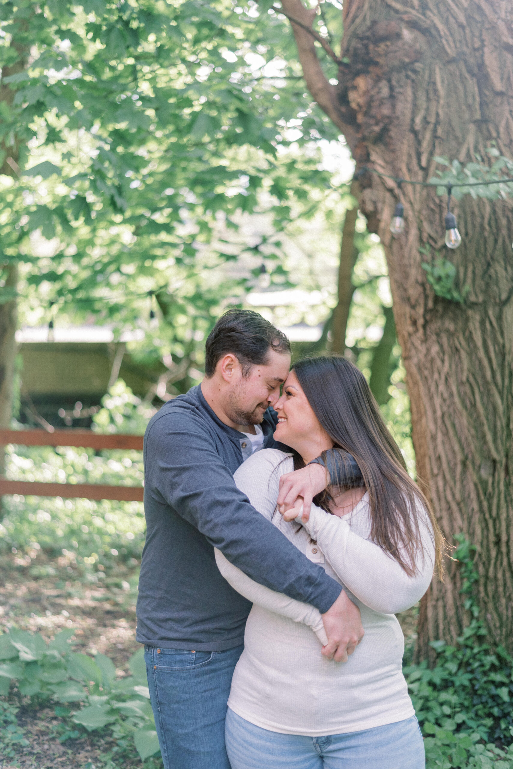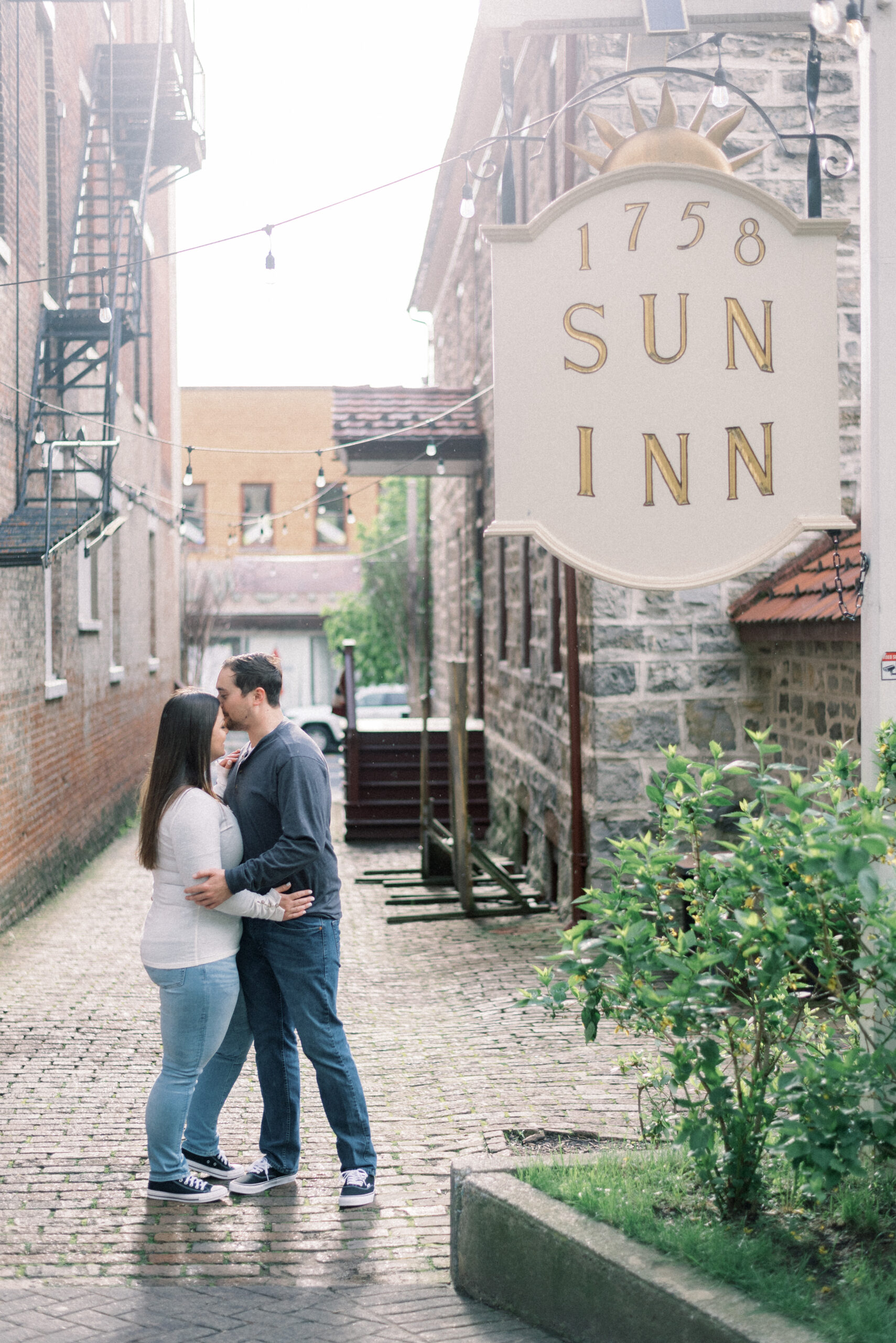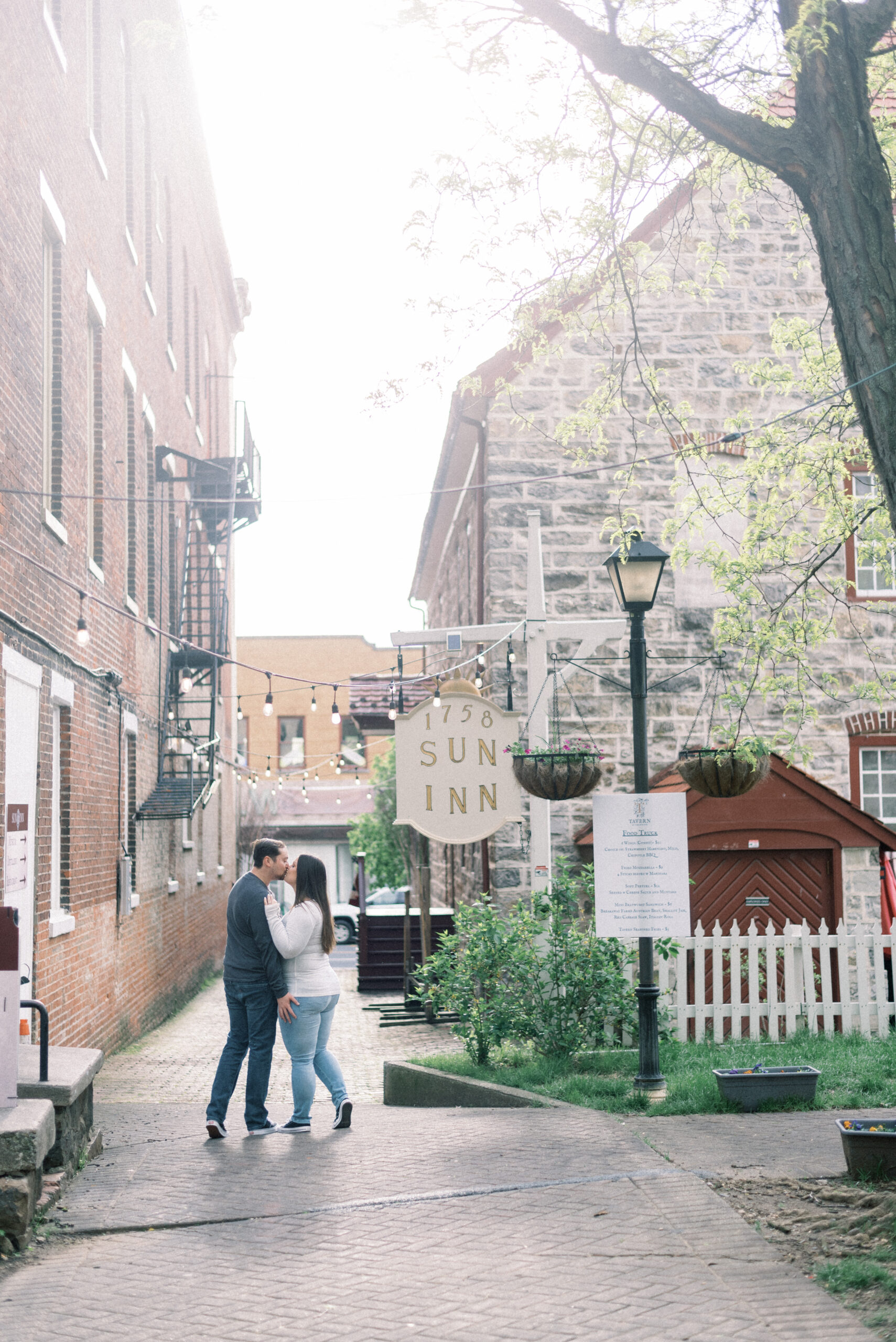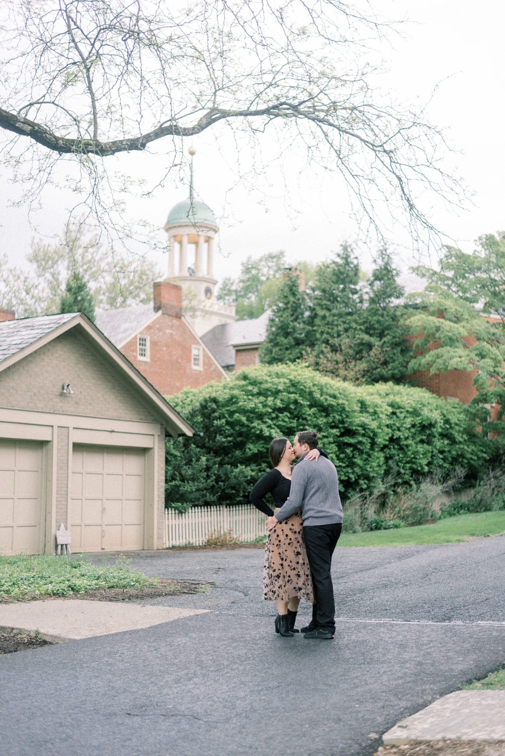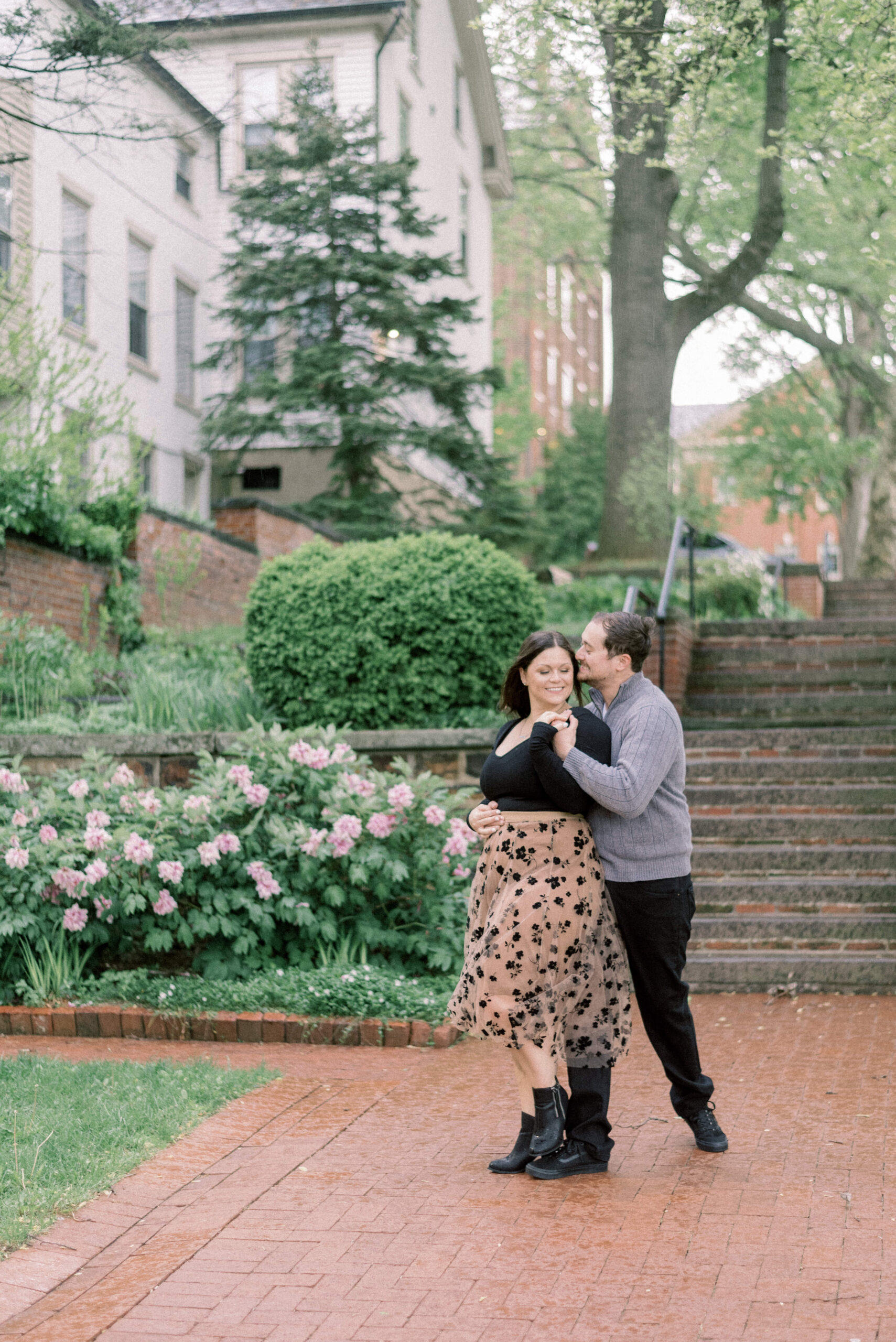 I so often start my blog posts discussing the weather that was taking place during the shoot from the images I’m about to share. I do so because it sets scene for the story that the couple or family were experiencing while we were together for their shoot and nothing could be more true for their Engagement Portraits in Bethlehem. The forecast all day called for spots of rain up until five o’clock, then it was partly cloudy with spots of sun. As I drove to Bethlehem, I faced an hours worth of downpour rain with the suspicion that their engagement portraits in Bethlehem were going to look a little different than we had planned. Thankfully by the time I arrived in Bethlehem, the rain had stopped and the sun came out. I drove around for a few minutes to find a place to park, pulled into the spot and as I got out of the car, the rain started again. Yet, the sun was shining. For their entire engagement session, it was on and off drizzling rain and sun, until the very end when the heavens kind of opened out. They didn’t open into a full torrential downpour, but it was enough to get you wet. We got to the very last pose in the courtyard of the church. We stood under the big oak tree for cover as it rained around us, I suggested we just wait it out for a few minutes to see if it would slow down and Trevor looked at Allie and said, “what do you think?” She responded, “I’m wet enough already, let’s just do it!” The two of them proceeded to have a romantic dance in the rain for their engagement portraits in Bethlehem.