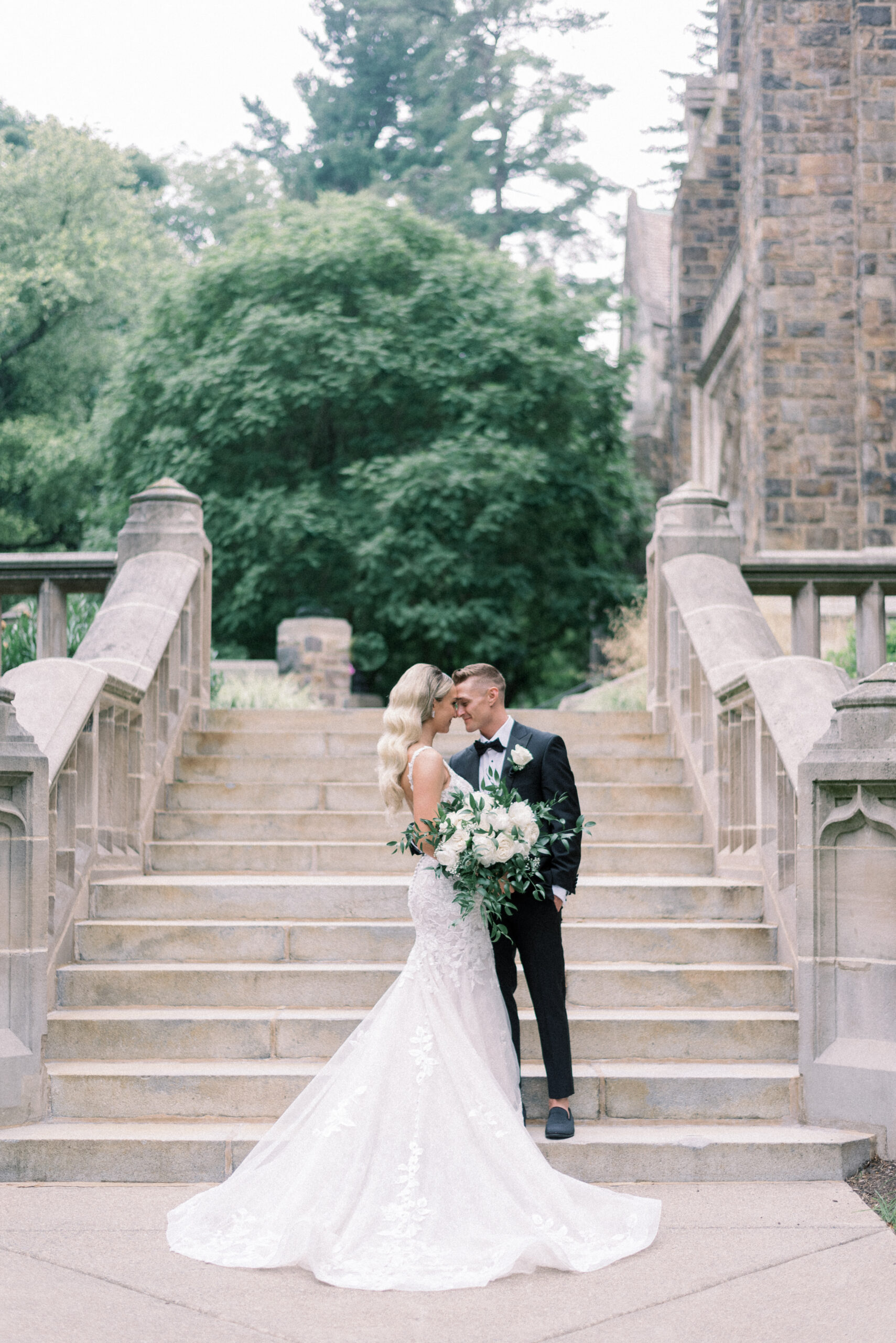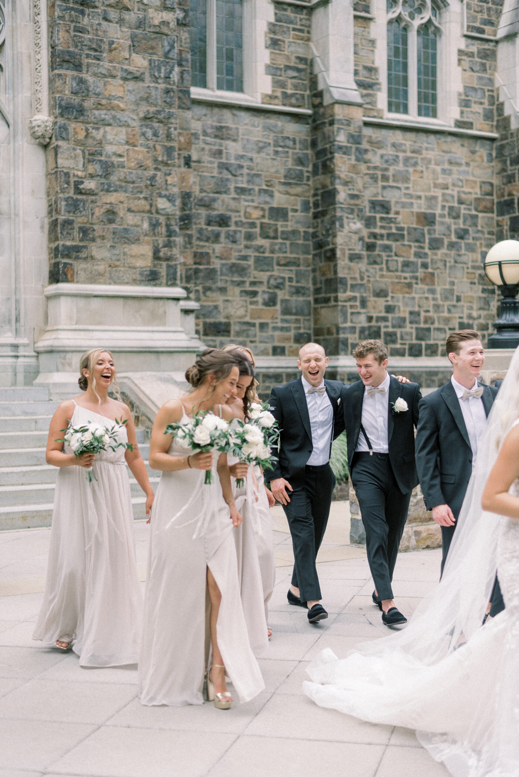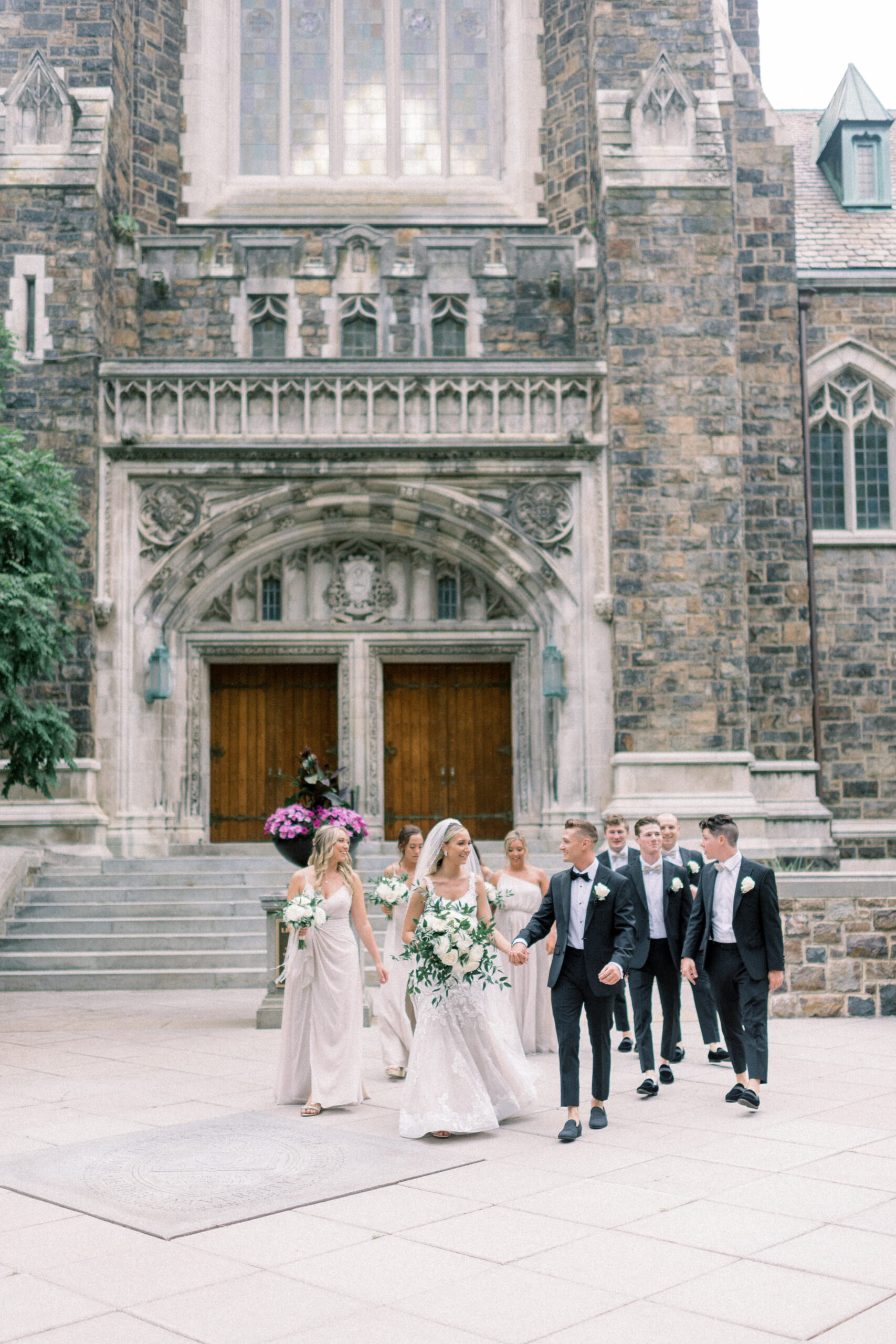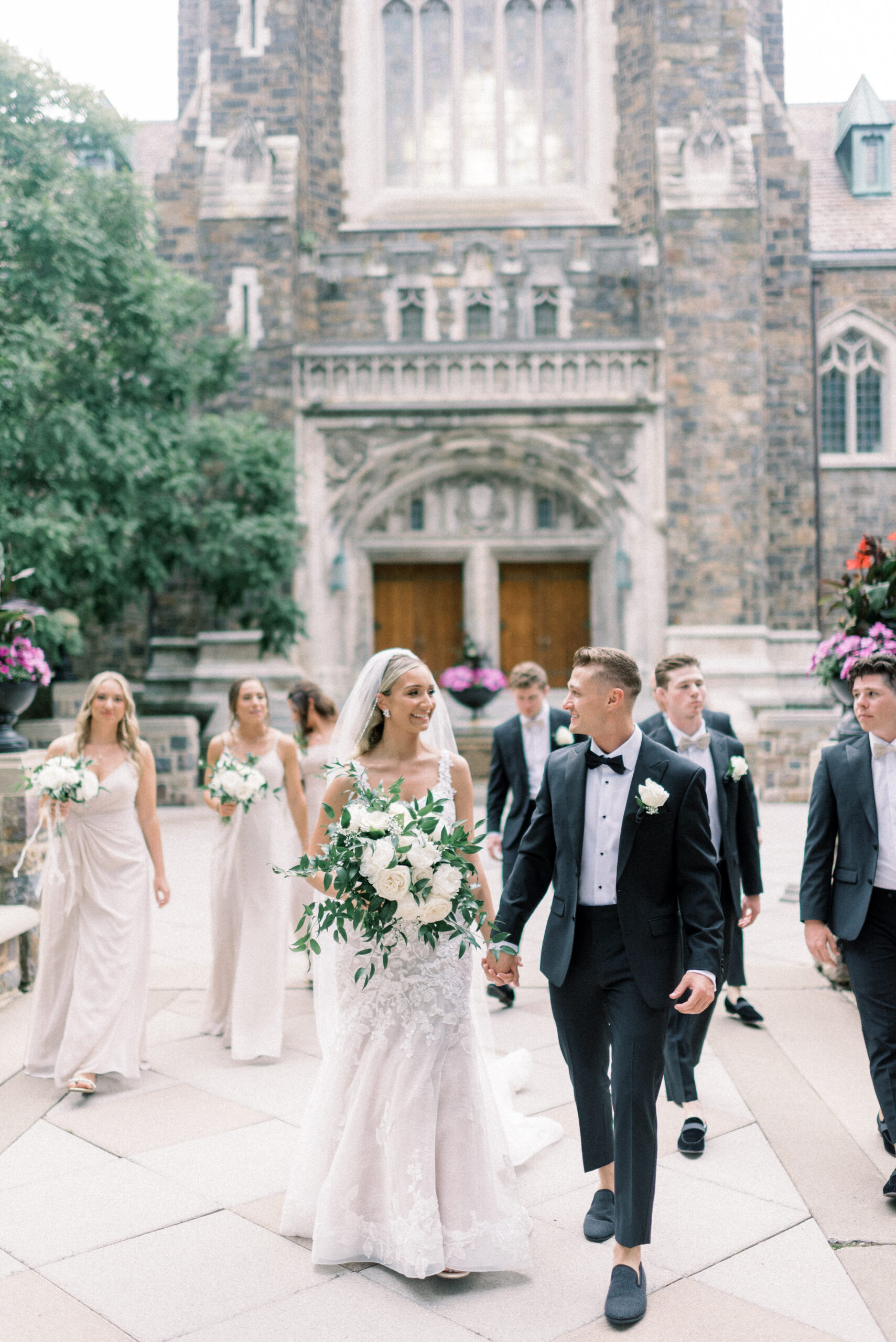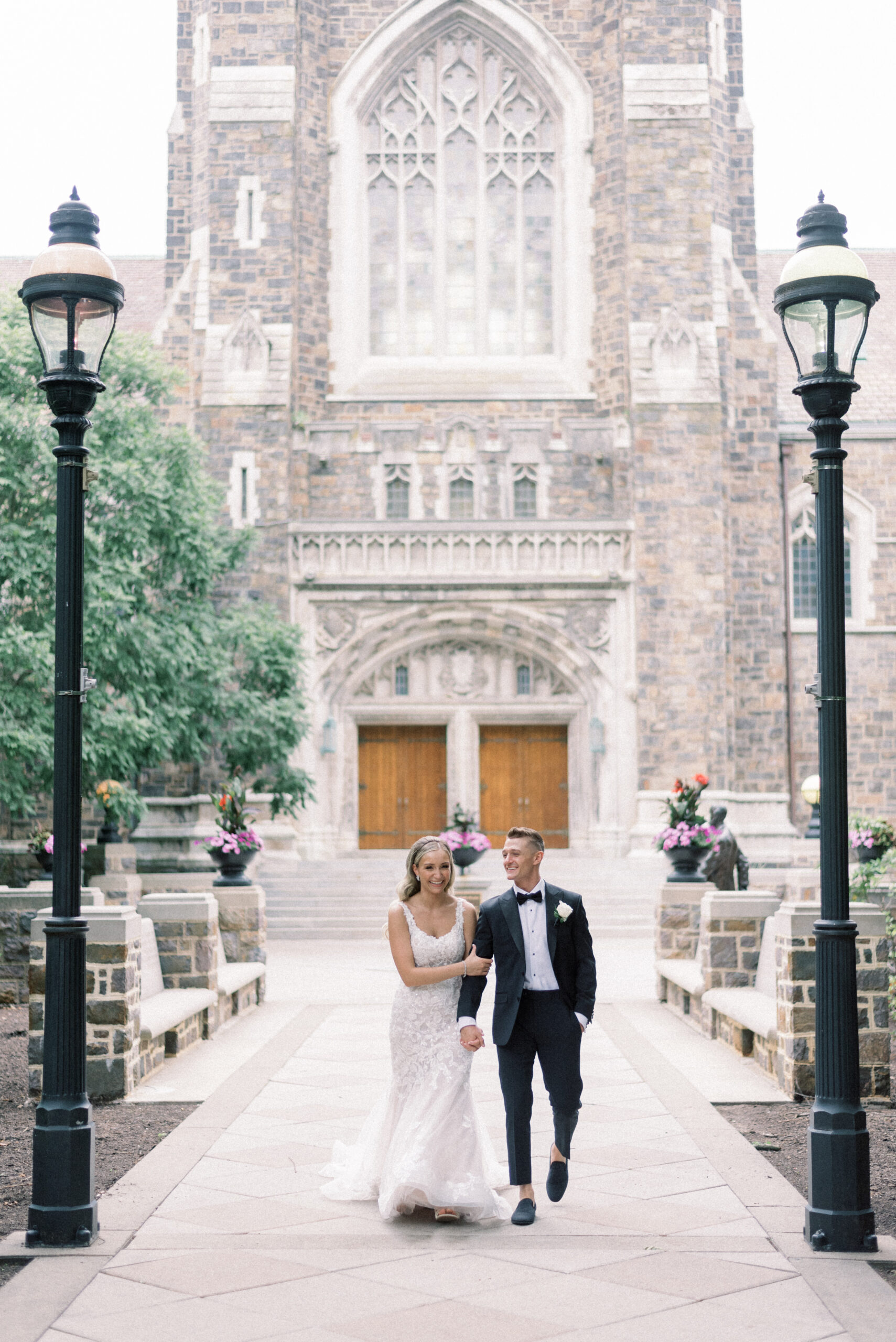 The stone wall of the church behind them, Holly in her Allure wedding dress, veil laying perfectly on her Hollywood Barbie waves as she and Scott privately read their vows to each other. My team and I commented later about how sweet and amazing it was that their vows, despite being written separately of each other, they perfectly mirrored the other. Each spoke of the past six years, their future, their faith and belief of God bringing them together and how thankful they are that He did. Holly and Scott’s Lehigh University wedding fell on one of the days we all experienced some heavy smoke from the Canada wildfires. As a result, it left a haze and overcast factor to the day. One wouldn’t ideally choose to have a day covered in wildfire smoke but it gave us the perfect conditions for some STUNNING light which means some stunning images. Then you pair that perfect light with the sheer attractiveness of Holly and Scott, of their bridal party and details and you’re creating the mixture for an incredible wedding then. Yet, we didn’t stop there! The amazing day was only intensified because these two, are two of the softest, kindest, faith rooted souls. Needless to say, their Lehigh University wedding was an incredible day! They choose to get ready near Lehigh Valley at the Wind Creek at Bethlehem hotel and then followed up their ceremony downstairs at Wind Creek at Bethlehem for their reception. It was a little extra special being at Wind Creek since it’s brand new and just opened for weddings! Holly and Scott were only their seventh couple to host their wedding reception there!