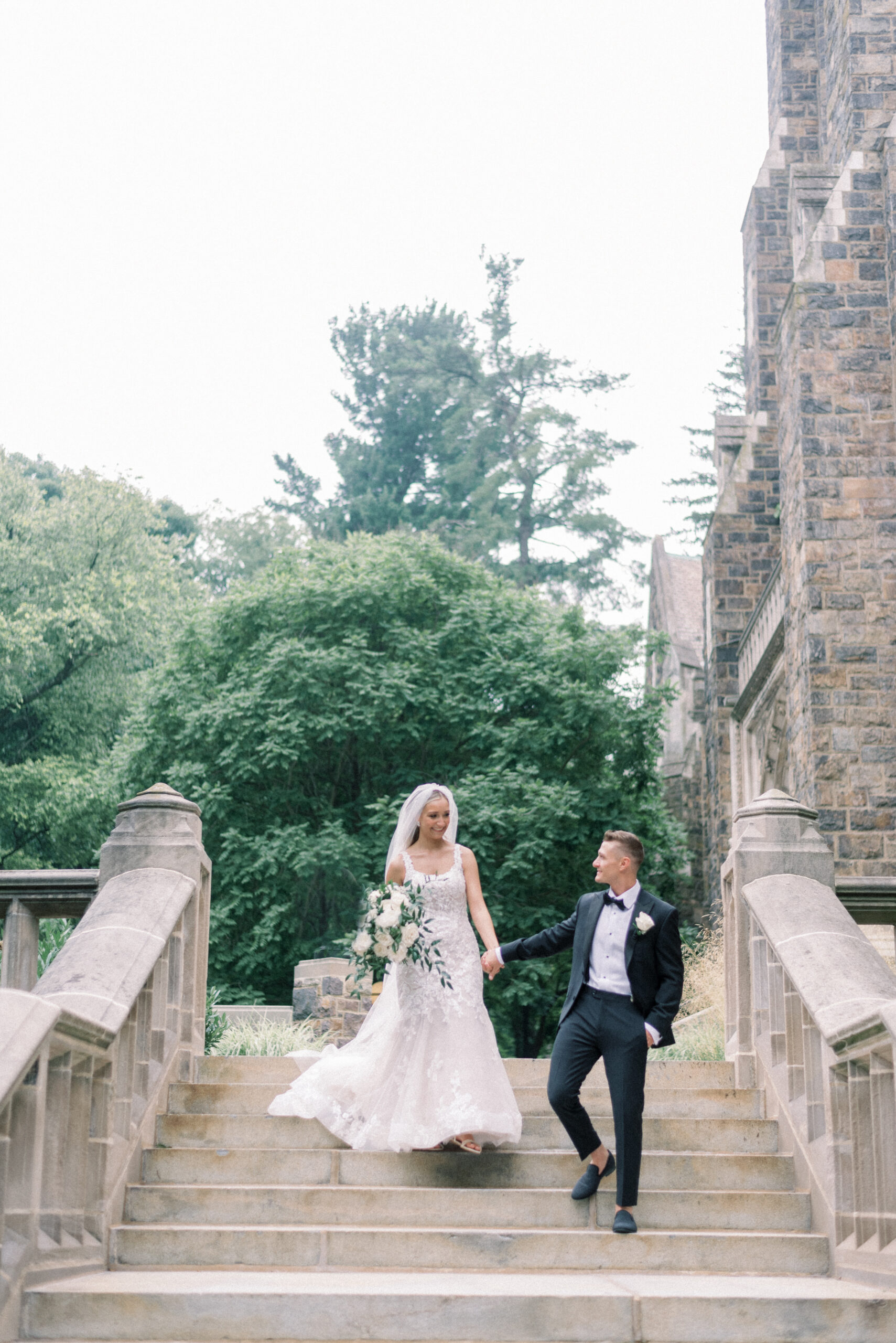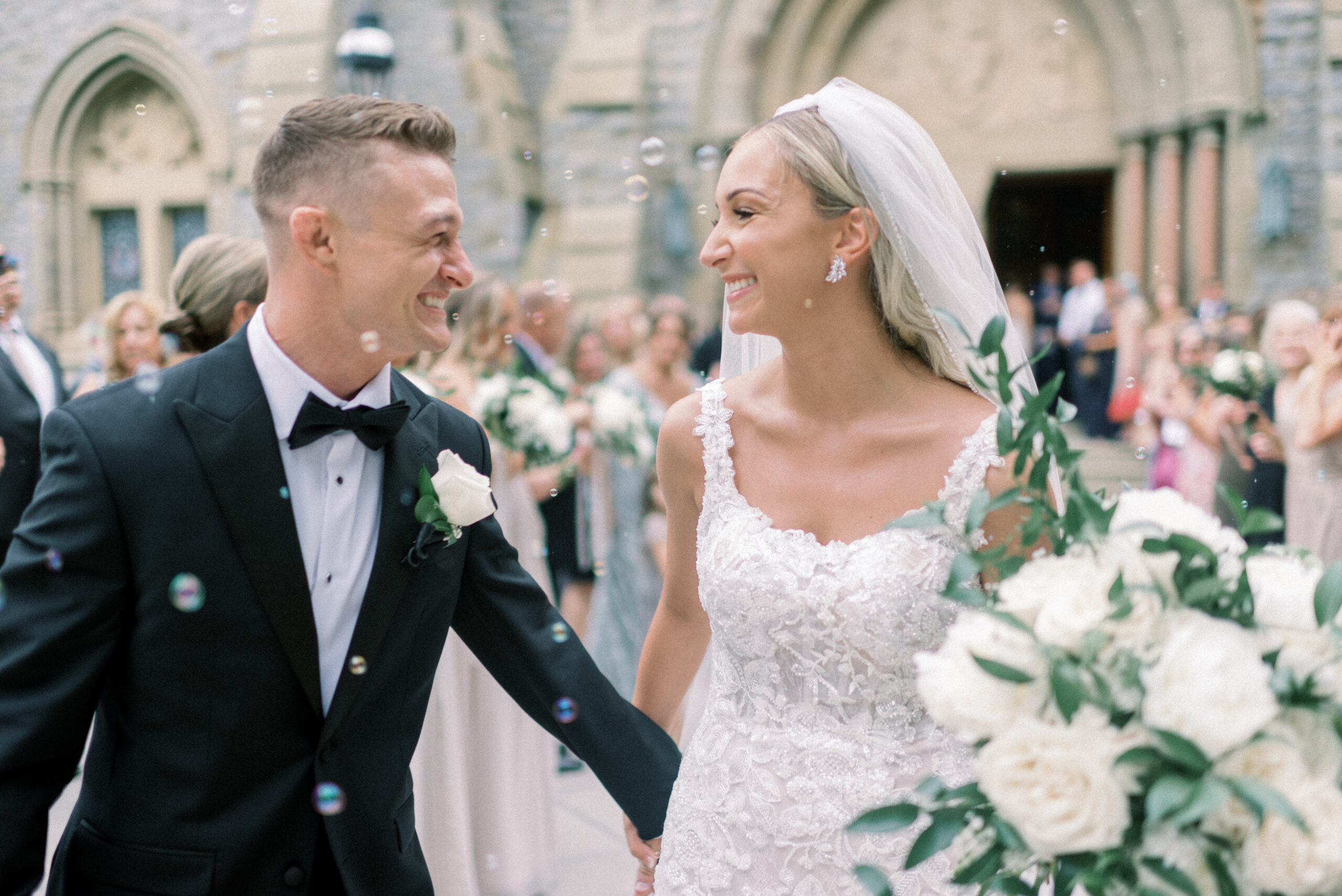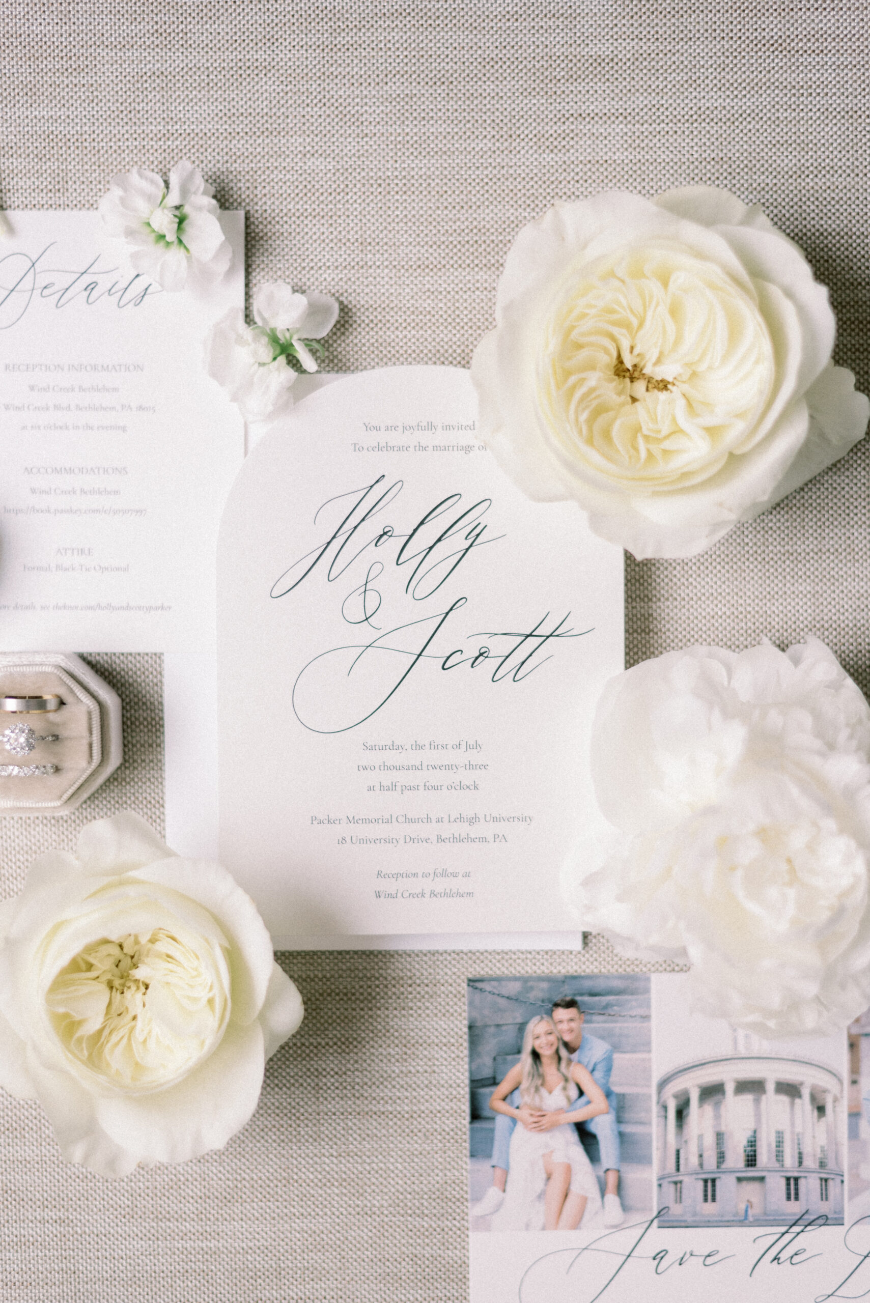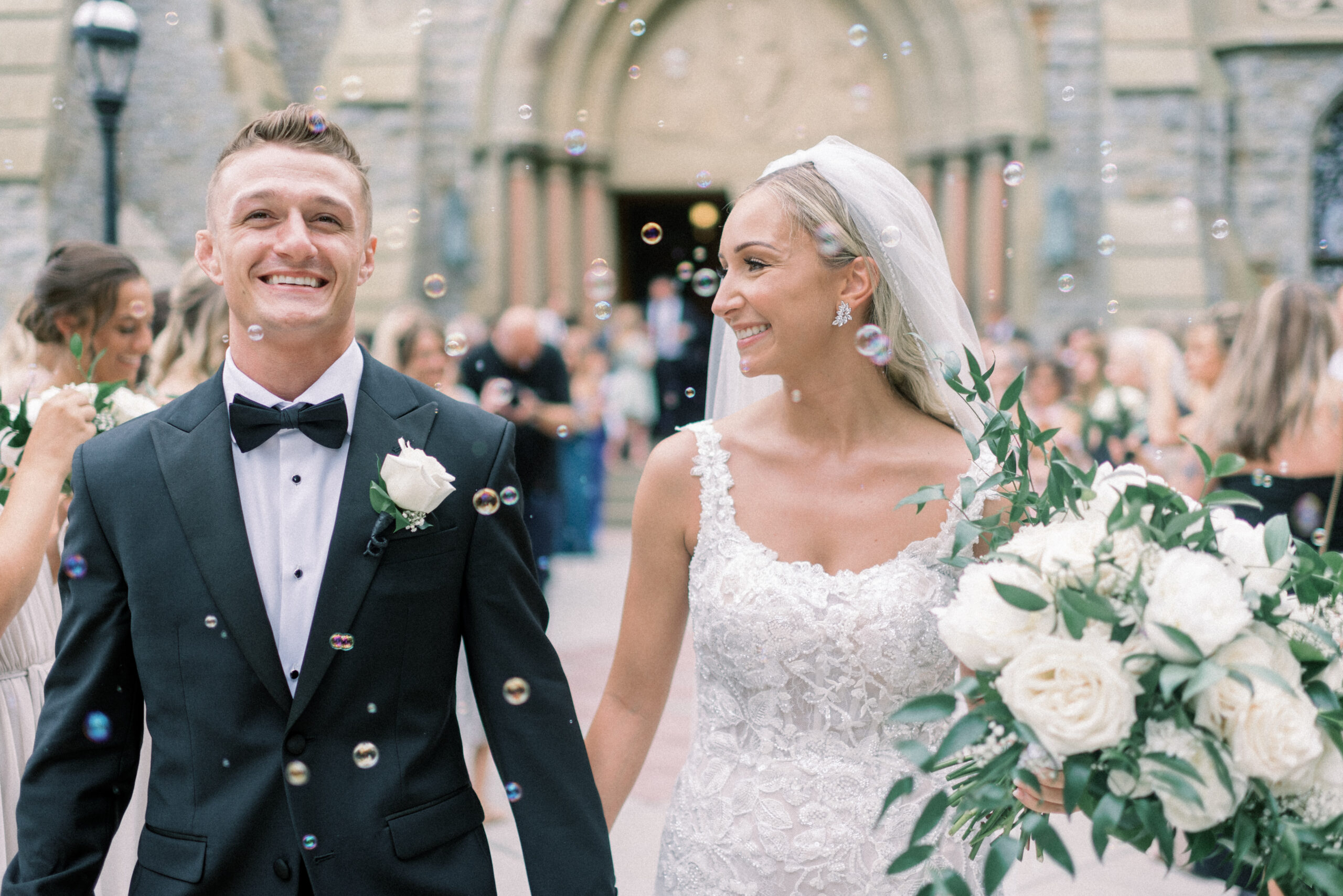 The stone wall of the church behind them, Holly in her Allure wedding dress, veil laying perfectly on her Hollywood Barbie waves as she and Scott privately read their vows to each other. My team and I commented later about how sweet and amazing it was that their vows, despite being written separately of each other, they perfectly mirrored the other. Each spoke of the past six years, their future, their faith and belief of God bringing them together and how thankful they are that He did. Holly and Scott’s Lehigh University wedding fell on one of the days we all experienced some heavy smoke from the Canada wildfires. As a result, it left a haze and overcast factor to the day. One wouldn’t ideally choose to have a day covered in wildfire smoke but it gave us the perfect conditions for some STUNNING light which means some stunning images. Then you pair that perfect light with the sheer attractiveness of Holly and Scott, of their bridal party and details and you’re creating the mixture for an incredible wedding then. Yet, we didn’t stop there! The amazing day was only intensified because these two, are two of the softest, kindest, faith rooted souls. Needless to say, their Lehigh University wedding was an incredible day! They choose to get ready near Lehigh Valley at the Wind Creek at Bethlehem hotel and then followed up their ceremony downstairs at Wind Creek at Bethlehem for their reception. It was a little extra special being at Wind Creek since it’s brand new and just opened for weddings! Holly and Scott were only their seventh couple to host their wedding reception there!