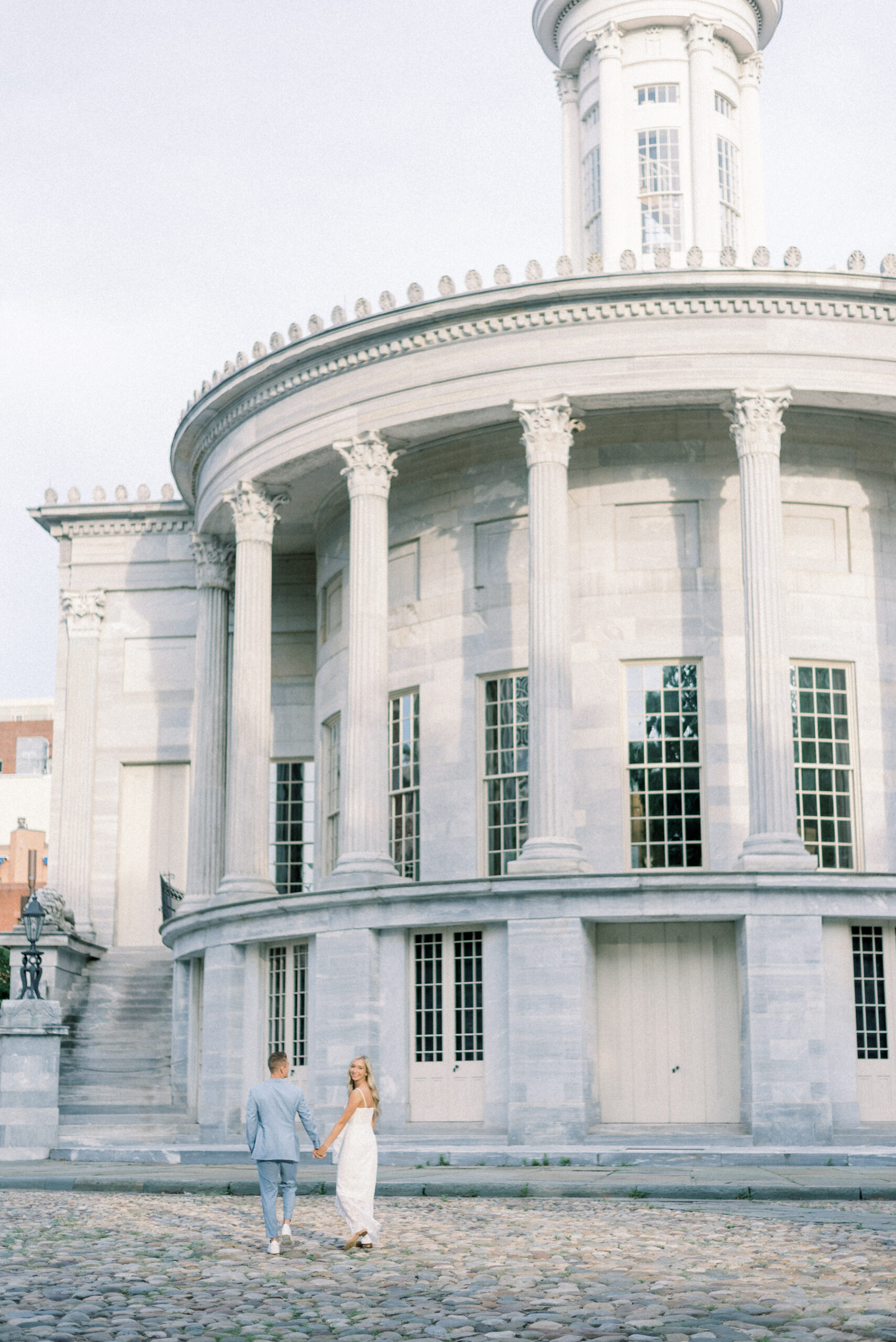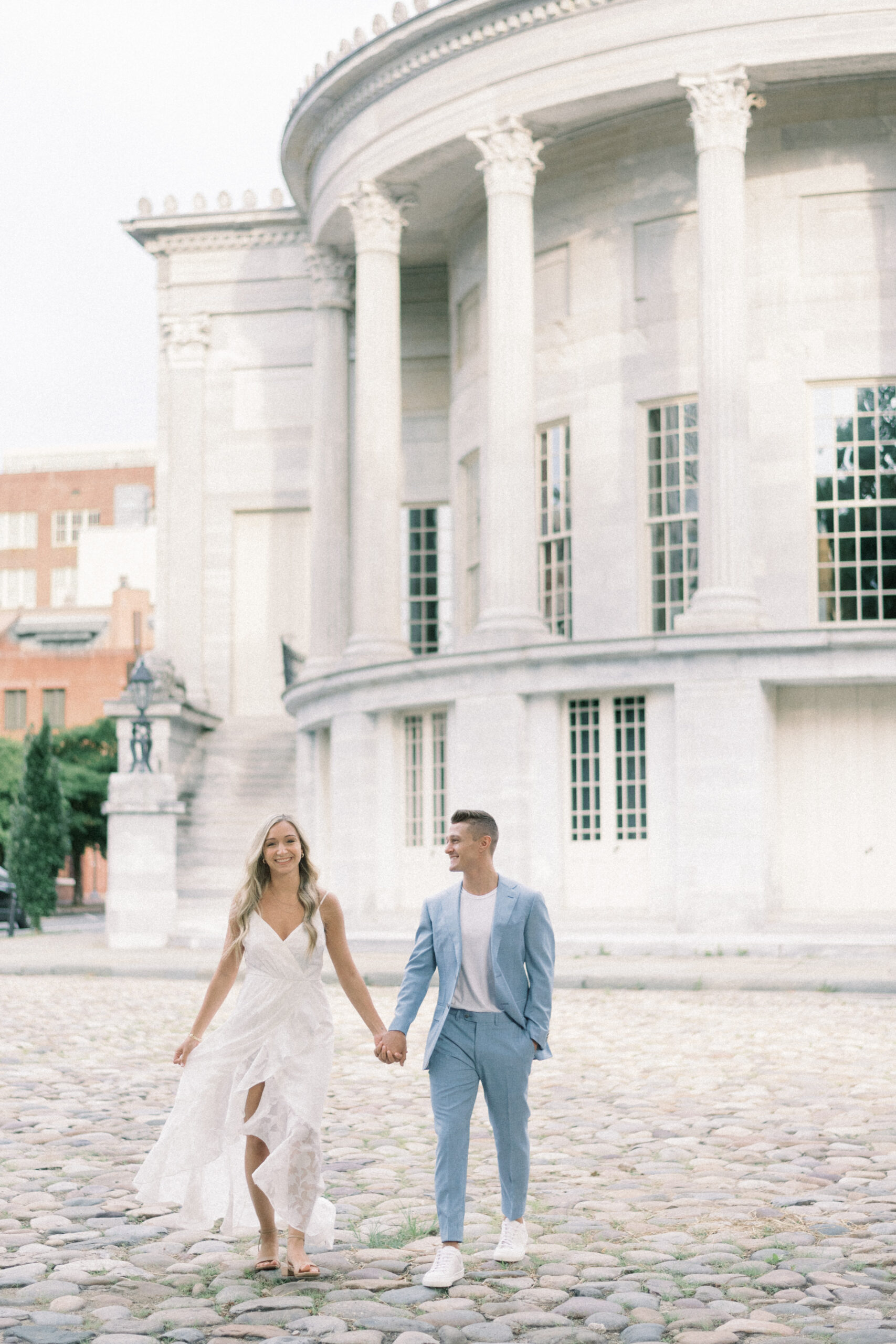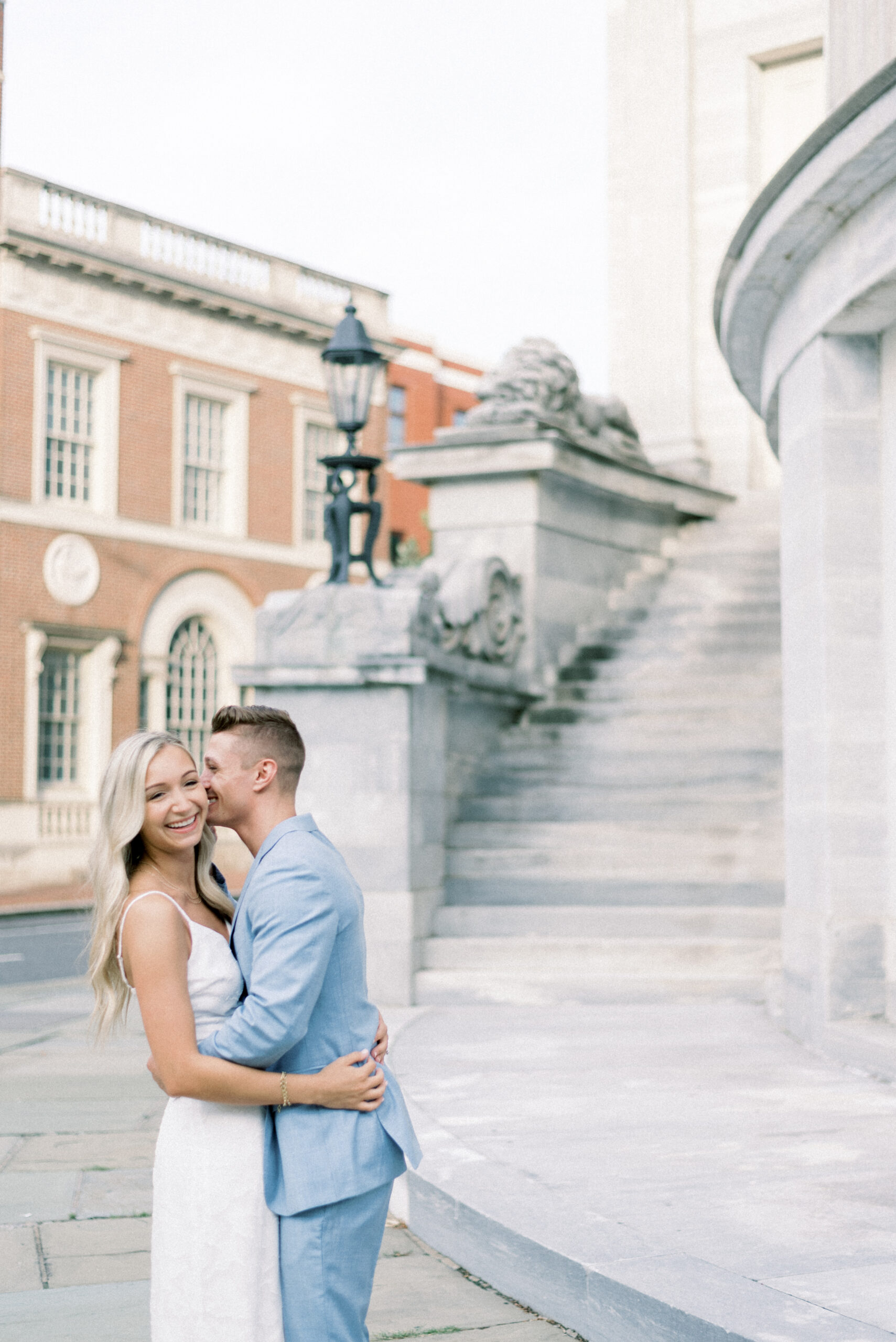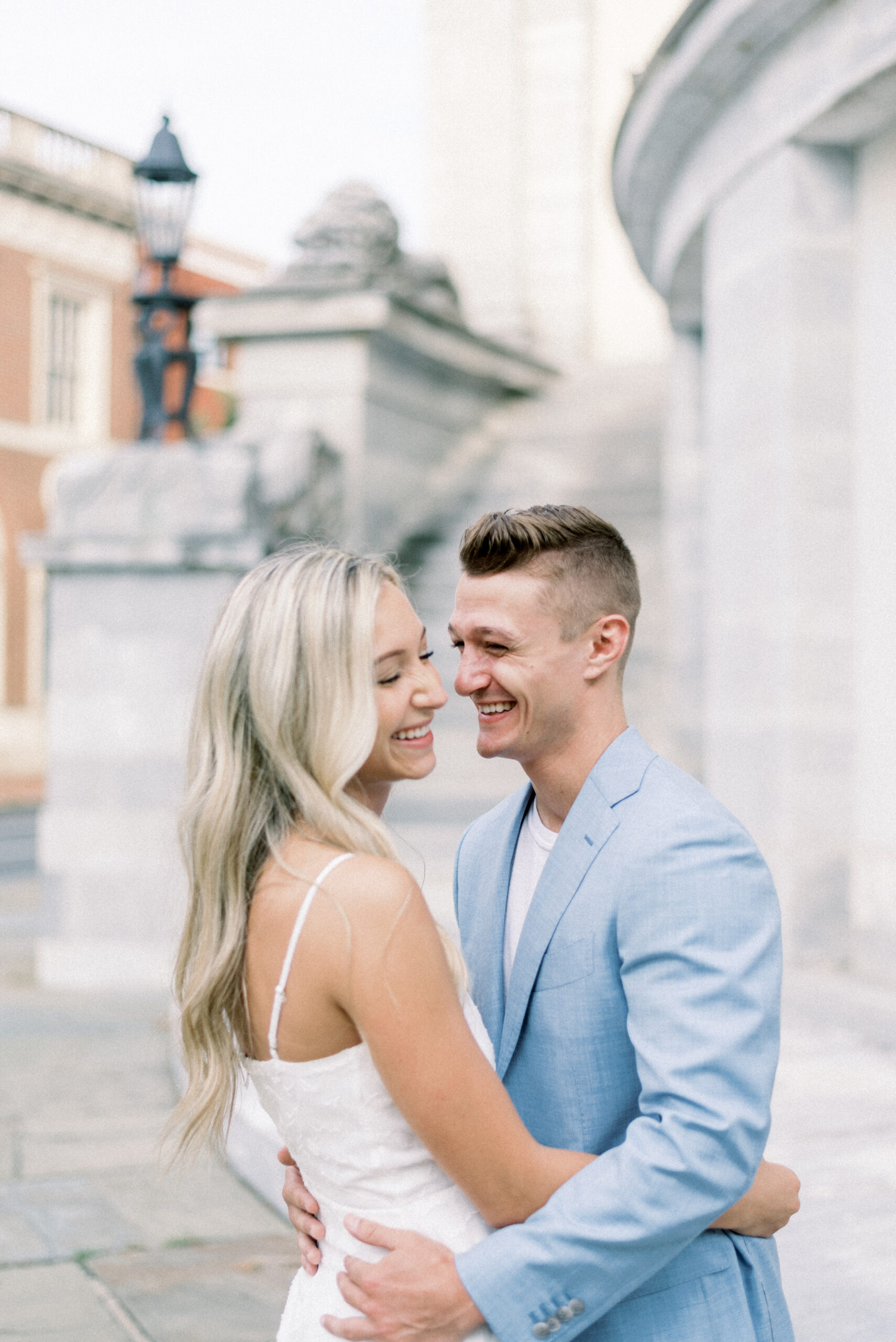 The morning sun hit the marble columns as the air heated up around us and things started to get sticky and sweaty. As we wrapped up their last pose for their Merchant Exchange Building Engagement Portraits, they nailed it with some real genuine effortless laughs, I said, “Well guys, that’s a wrap. You guys totally killed it!” Scott responded, “That’s awesome! I’m really excited. These were so much better, faster and easier than I thought they would be. Thank you so much!” My goal with your engagement portrait session, while it is to provide you with portraits to capture this season in your life, the real goal of your engagement portraits is to build trust between the three of us and learn how you are in front of the camera. So often grooms are not the biggest fans of portrait time on their wedding day and by learning at their engagement session that I am not going to keep you for longer than I need you and that we can still get quality images in a short period of time allows them to relax and trust me on the wedding day. Trust me to give me fifteen to twenty minutes and I will release them to go enjoy the rest of the day and you both know that those images that we captured on the most important day of your life are going to be quality, effortless moments from your day.