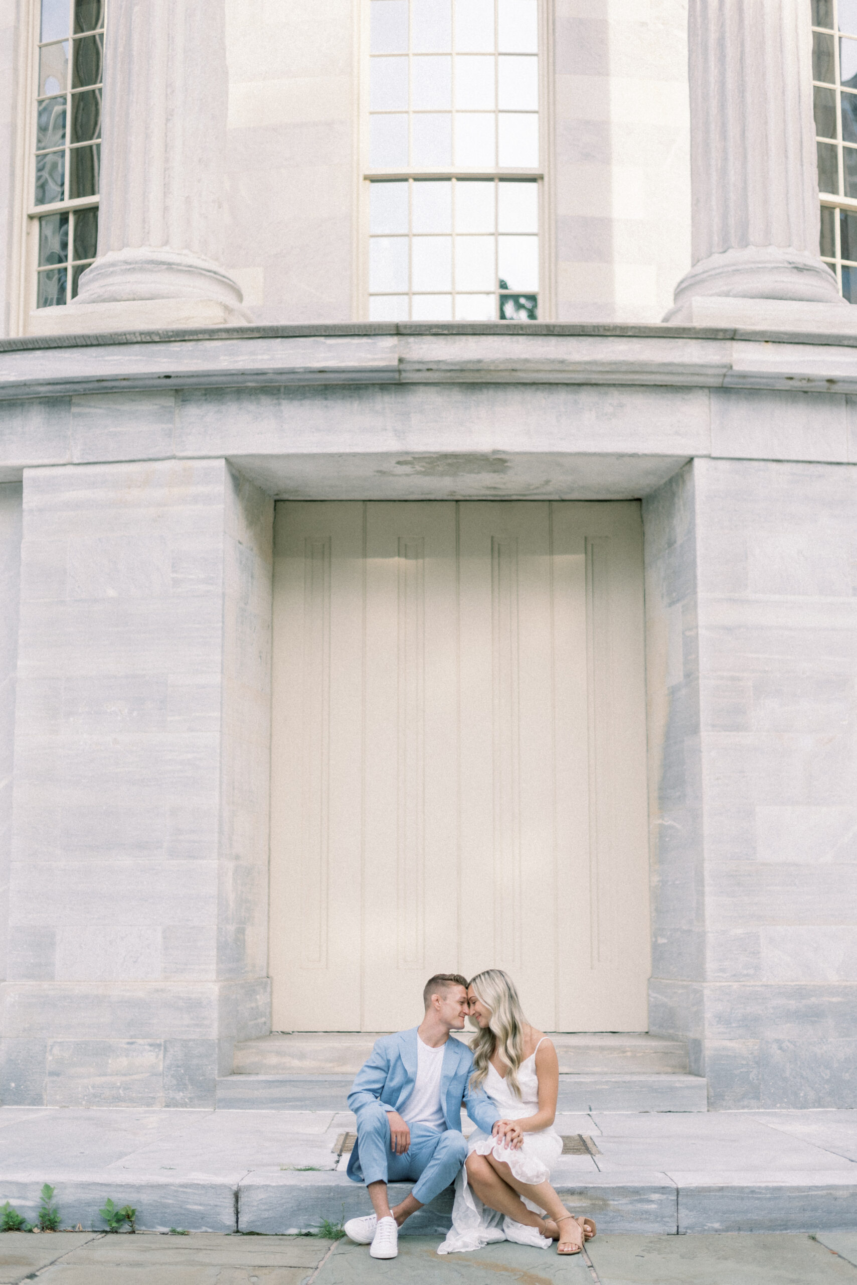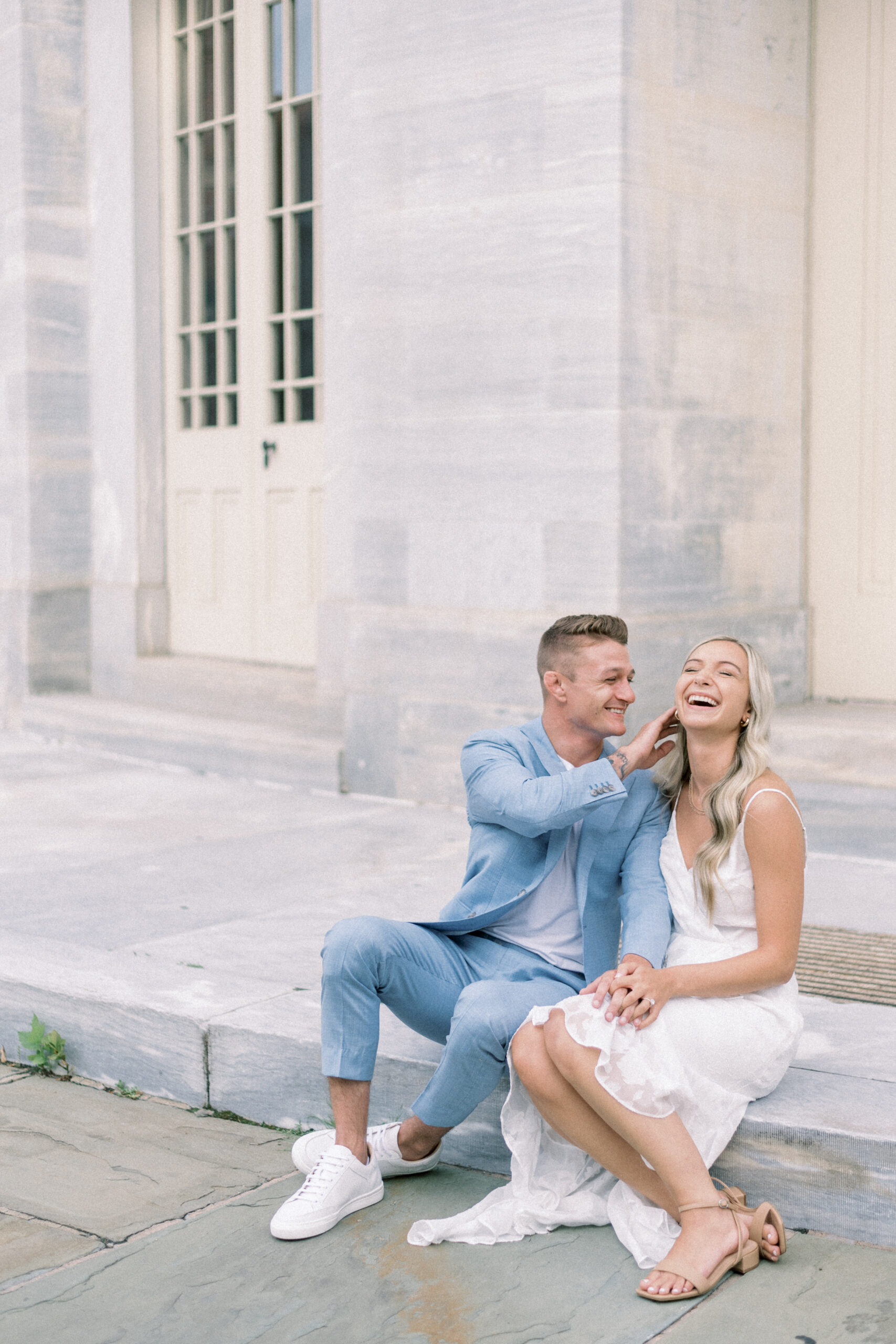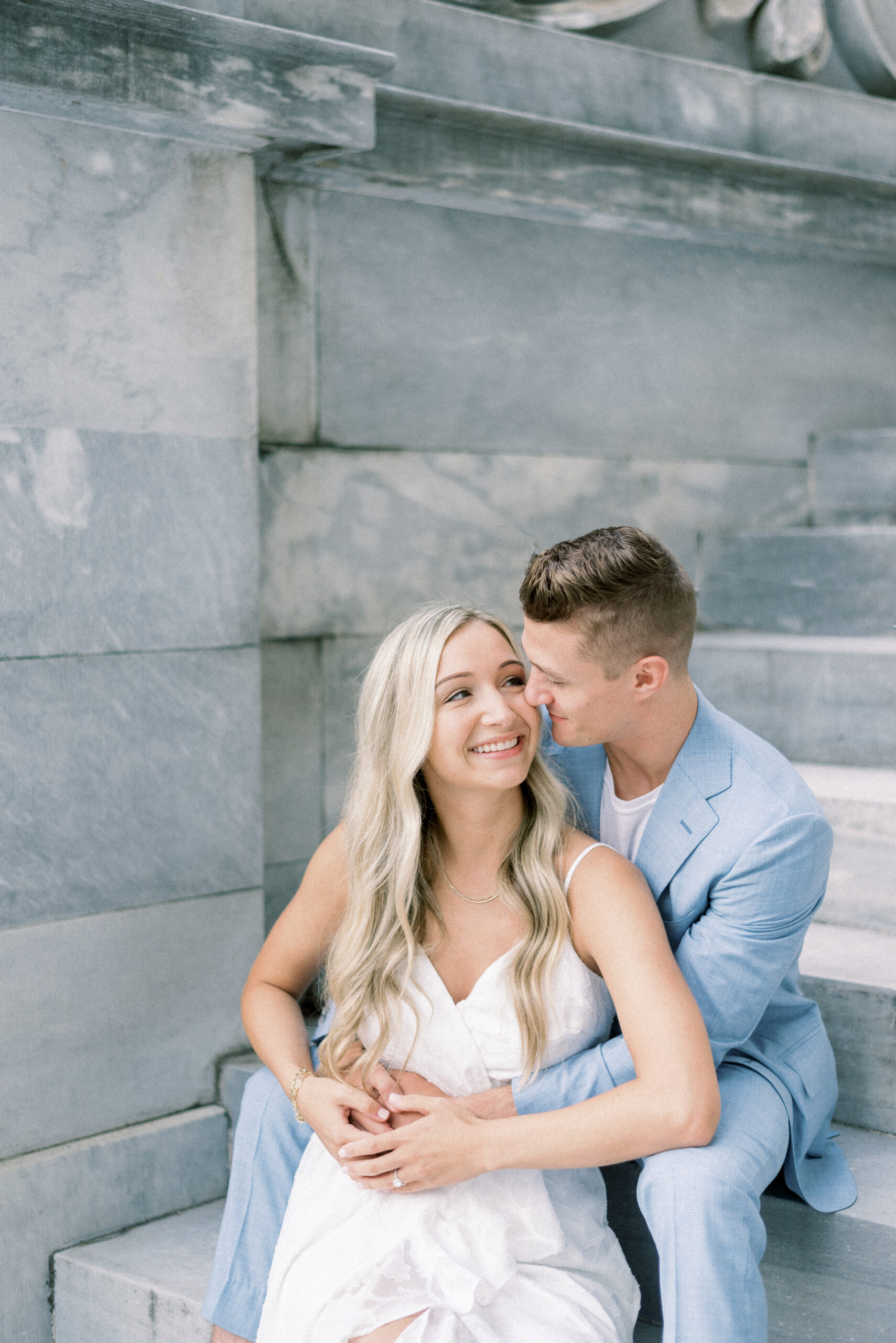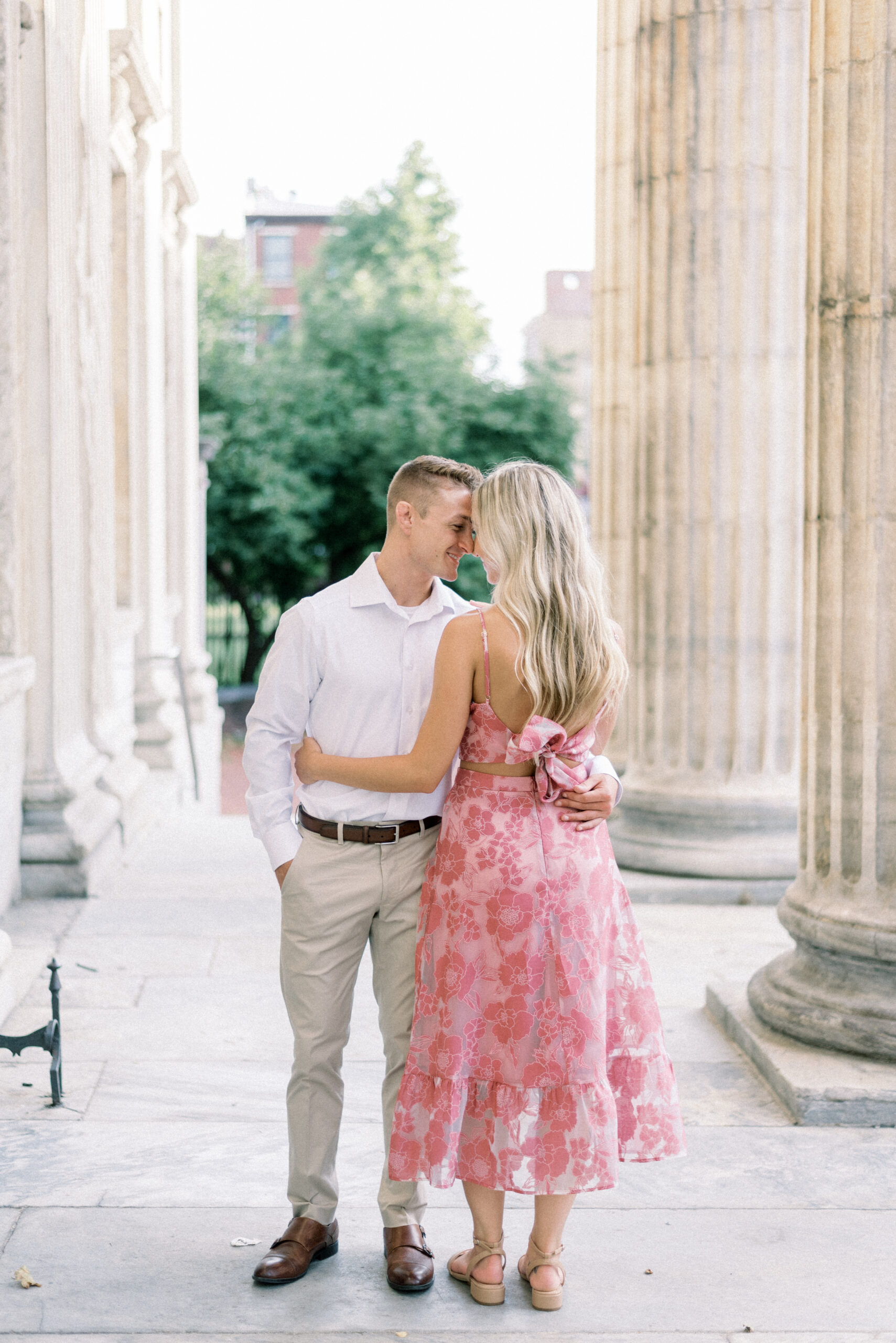 The morning sun hit the marble columns as the air heated up around us and things started to get sticky and sweaty. As we wrapped up their last pose for their Merchant Exchange Building Engagement Portraits, they nailed it with some real genuine effortless laughs, I said, “Well guys, that’s a wrap. You guys totally killed it!” Scott responded, “That’s awesome! I’m really excited. These were so much better, faster and easier than I thought they would be. Thank you so much!” My goal with your engagement portrait session, while it is to provide you with portraits to capture this season in your life, the real goal of your engagement portraits is to build trust between the three of us and learn how you are in front of the camera. So often grooms are not the biggest fans of portrait time on their wedding day and by learning at their engagement session that I am not going to keep you for longer than I need you and that we can still get quality images in a short period of time allows them to relax and trust me on the wedding day. Trust me to give me fifteen to twenty minutes and I will release them to go enjoy the rest of the day and you both know that those images that we captured on the most important day of your life are going to be quality, effortless moments from your day.