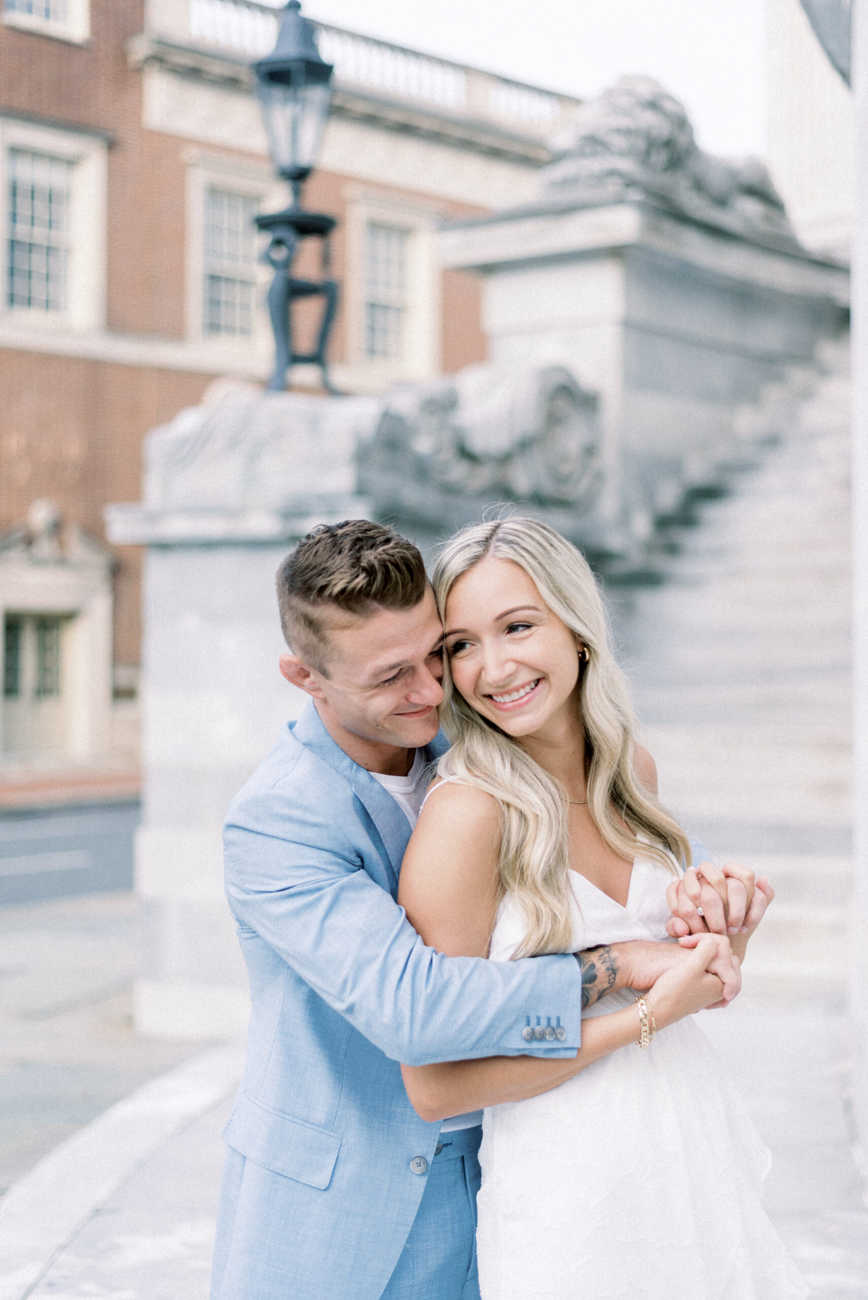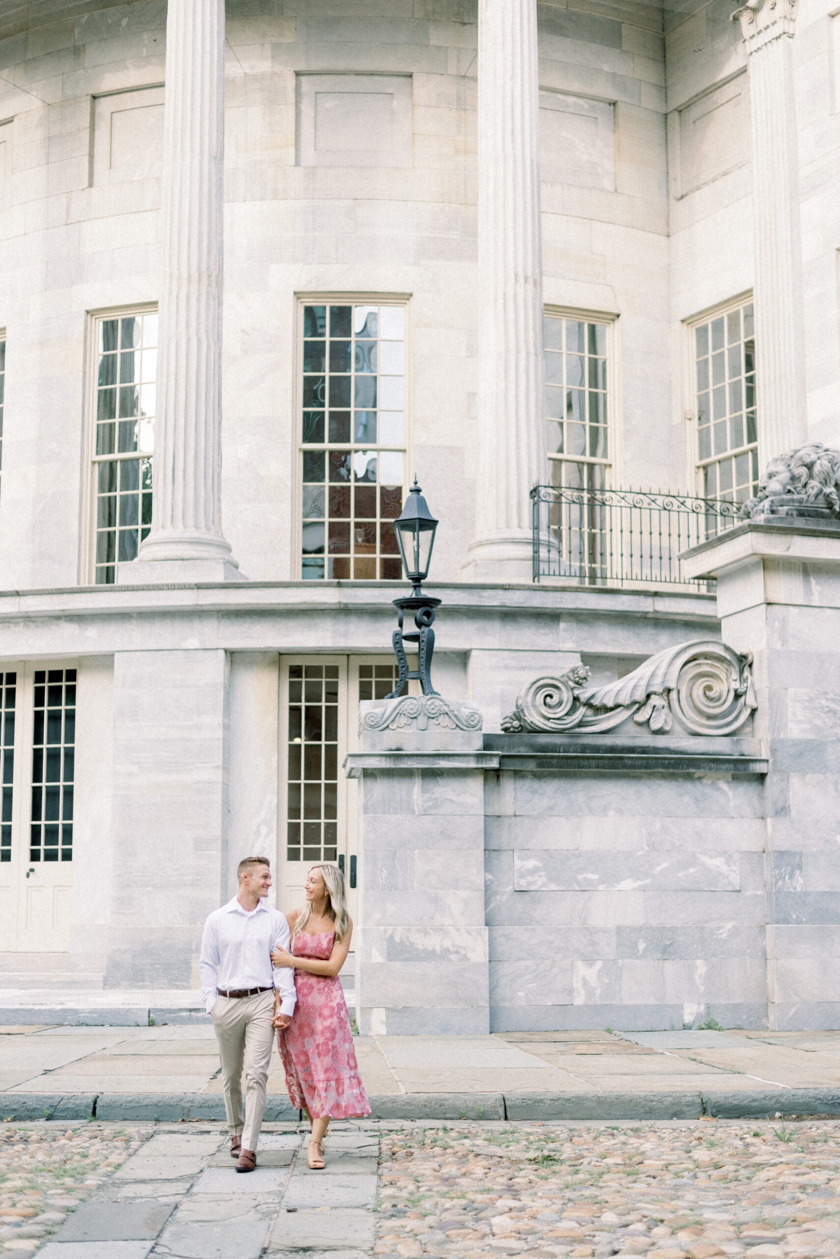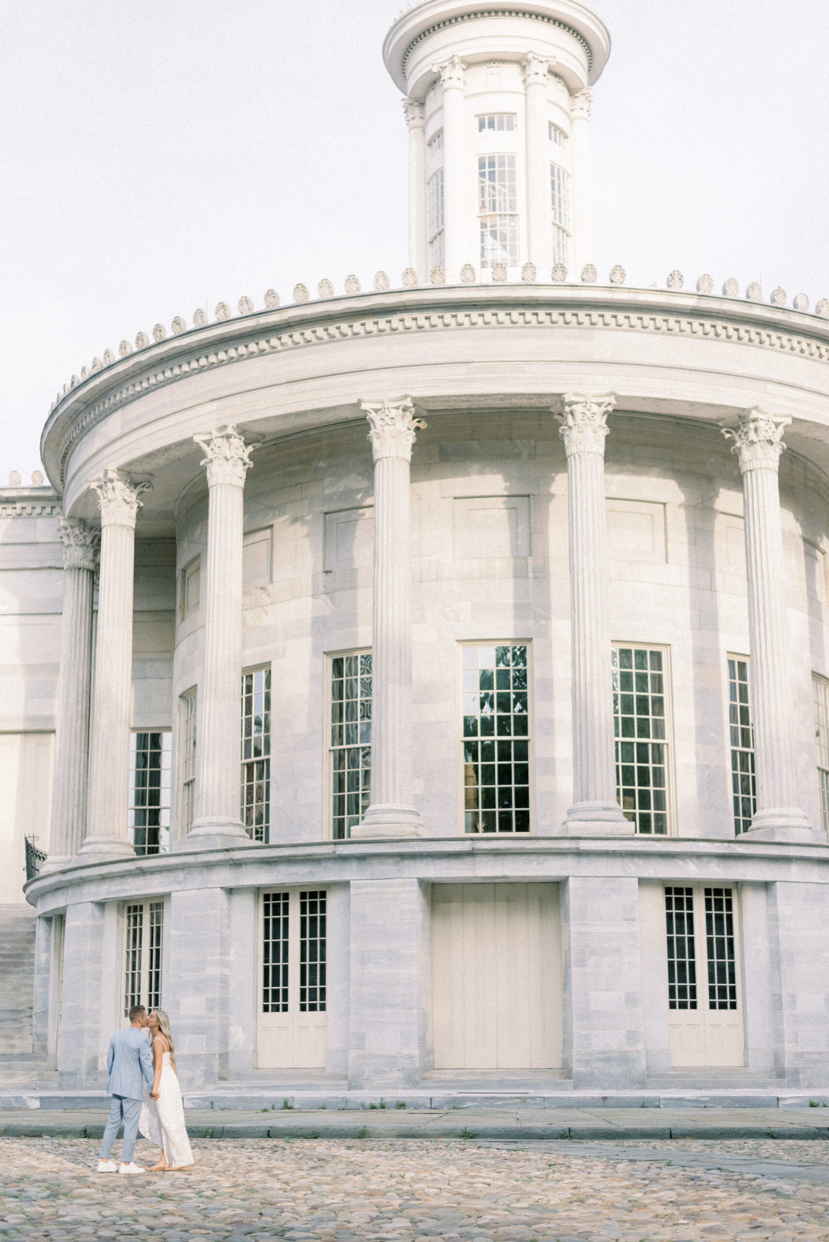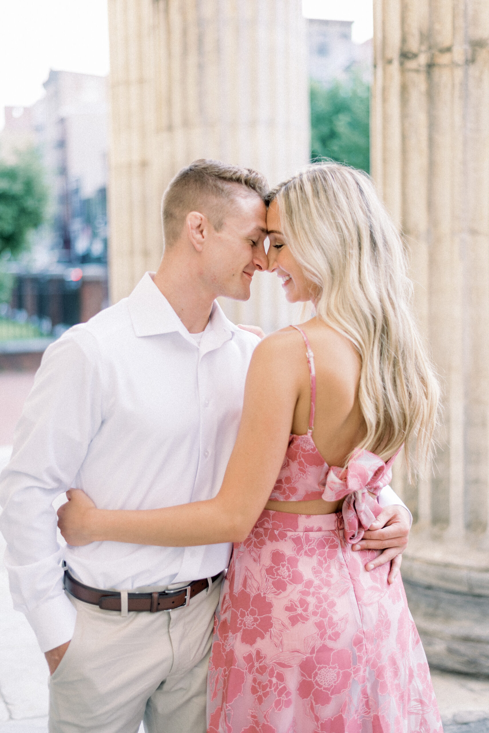 The morning sun hit the marble columns as the air heated up around us and things started to get sticky and sweaty. As we wrapped up their last pose for their Merchant Exchange Building Engagement Portraits, they nailed it with some real genuine effortless laughs, I said, “Well guys, that’s a wrap. You guys totally killed it!” Scott responded, “That’s awesome! I’m really excited. These were so much better, faster and easier than I thought they would be. Thank you so much!” My goal with your engagement portrait session, while it is to provide you with portraits to capture this season in your life, the real goal of your engagement portraits is to build trust between the three of us and learn how you are in front of the camera. So often grooms are not the biggest fans of portrait time on their wedding day and by learning at their engagement session that I am not going to keep you for longer than I need you and that we can still get quality images in a short period of time allows them to relax and trust me on the wedding day. Trust me to give me fifteen to twenty minutes and I will release them to go enjoy the rest of the day and you both know that those images that we captured on the most important day of your life are going to be quality, effortless moments from your day.