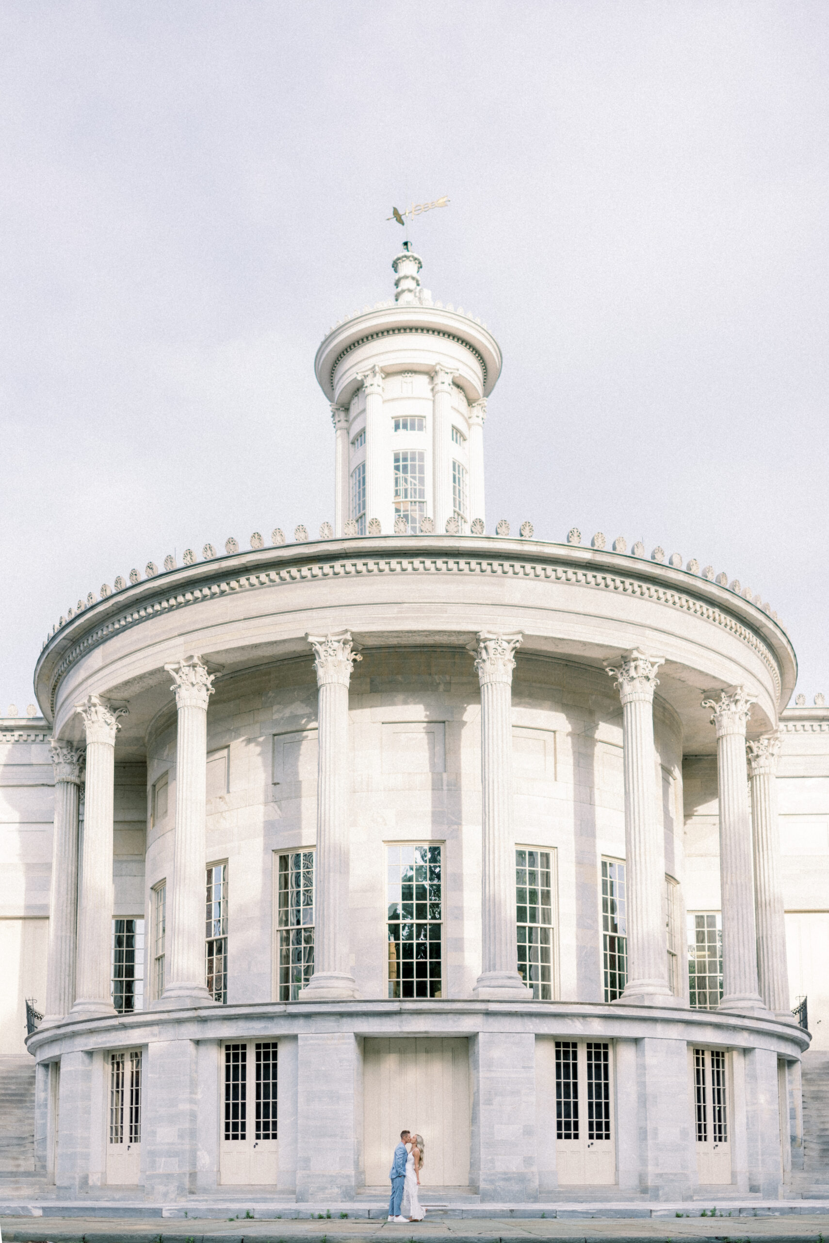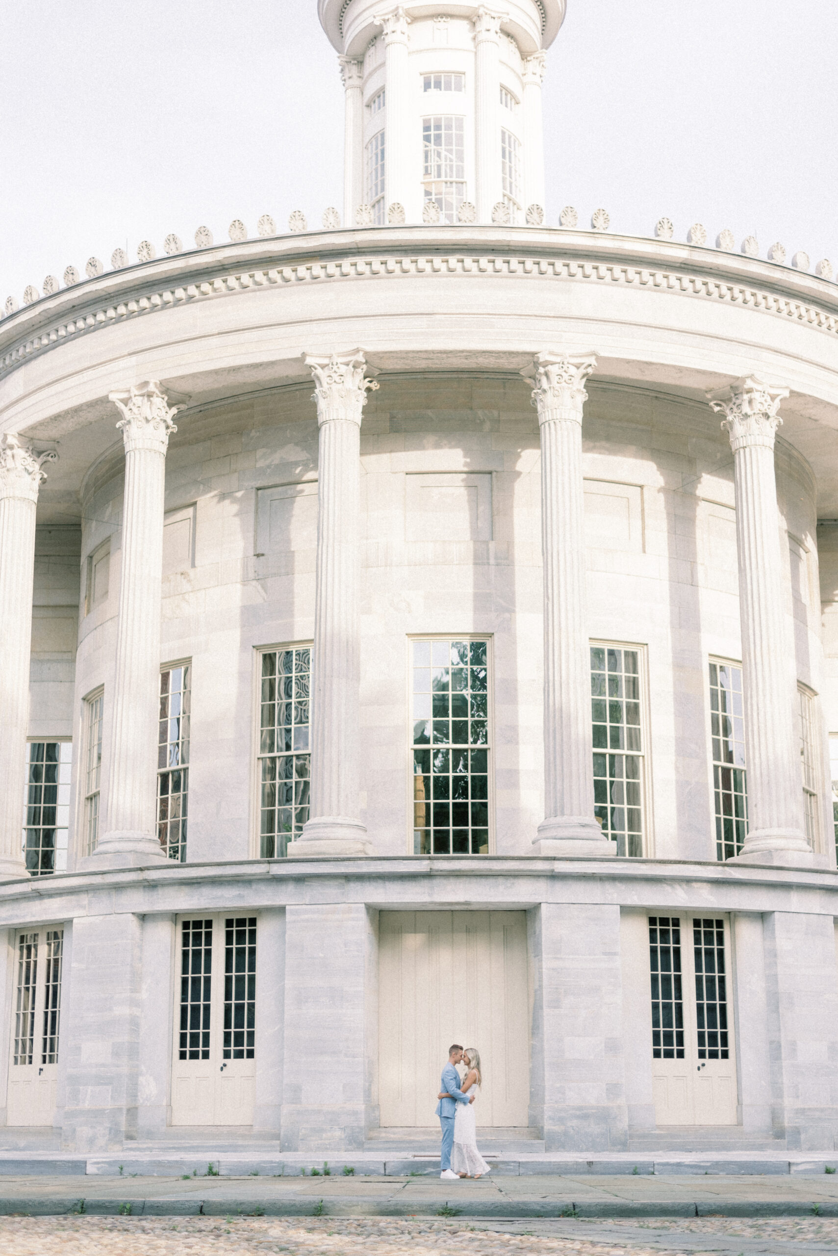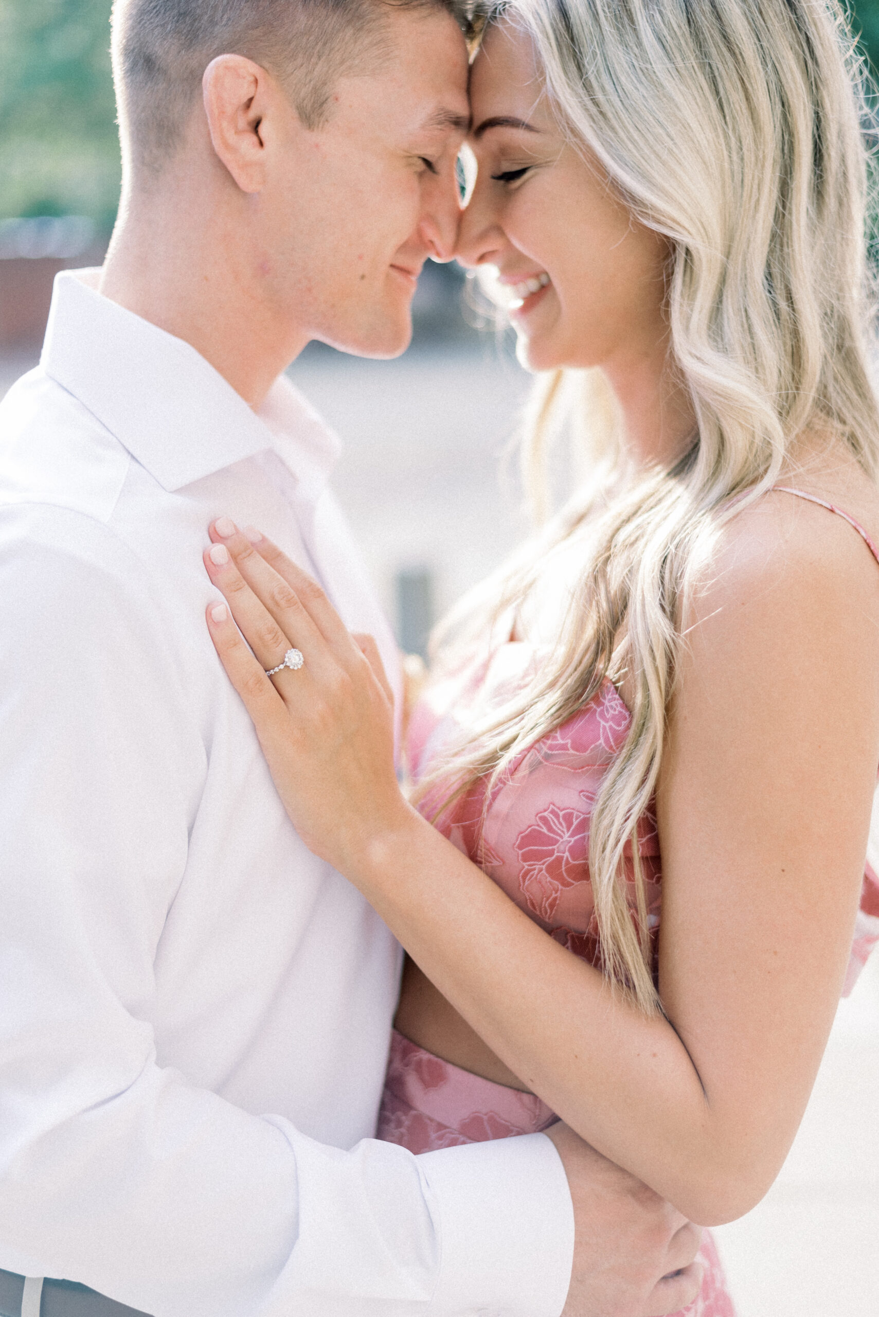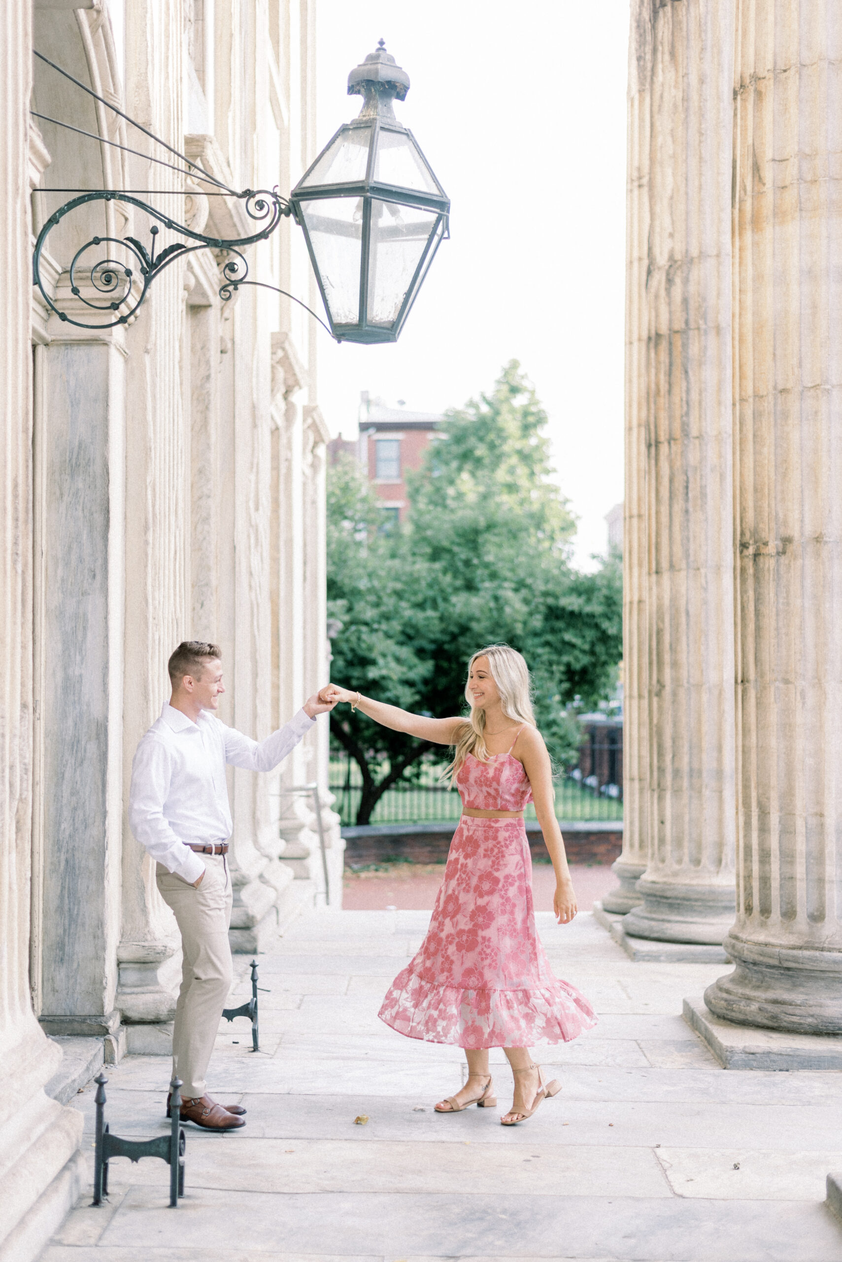 The morning sun hit the marble columns as the air heated up around us and things started to get sticky and sweaty. As we wrapped up their last pose for their Merchant Exchange Building Engagement Portraits, they nailed it with some real genuine effortless laughs, I said, “Well guys, that’s a wrap. You guys totally killed it!” Scott responded, “That’s awesome! I’m really excited. These were so much better, faster and easier than I thought they would be. Thank you so much!” My goal with your engagement portrait session, while it is to provide you with portraits to capture this season in your life, the real goal of your engagement portraits is to build trust between the three of us and learn how you are in front of the camera. So often grooms are not the biggest fans of portrait time on their wedding day and by learning at their engagement session that I am not going to keep you for longer than I need you and that we can still get quality images in a short period of time allows them to relax and trust me on the wedding day. Trust me to give me fifteen to twenty minutes and I will release them to go enjoy the rest of the day and you both know that those images that we captured on the most important day of your life are going to be quality, effortless moments from your day.