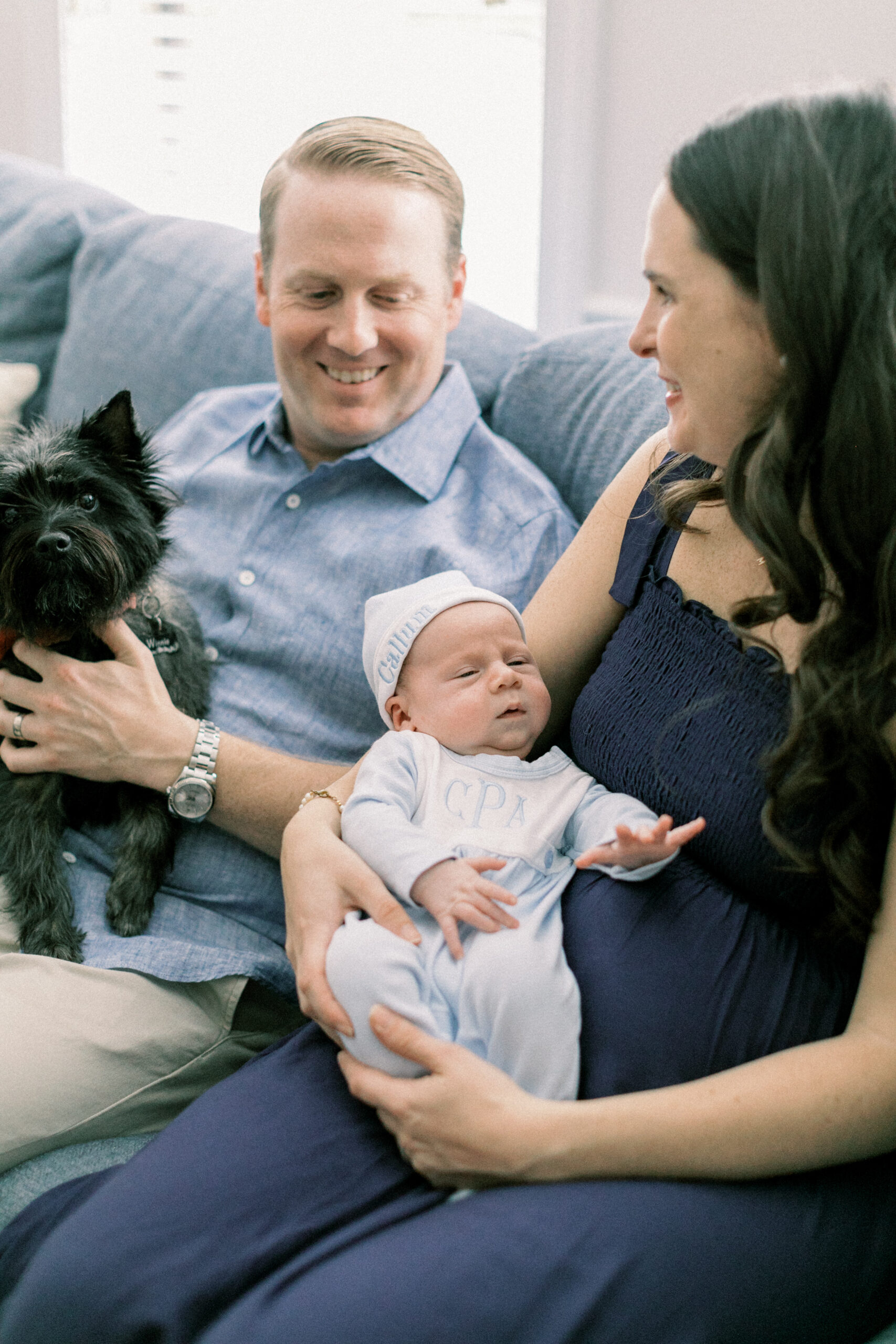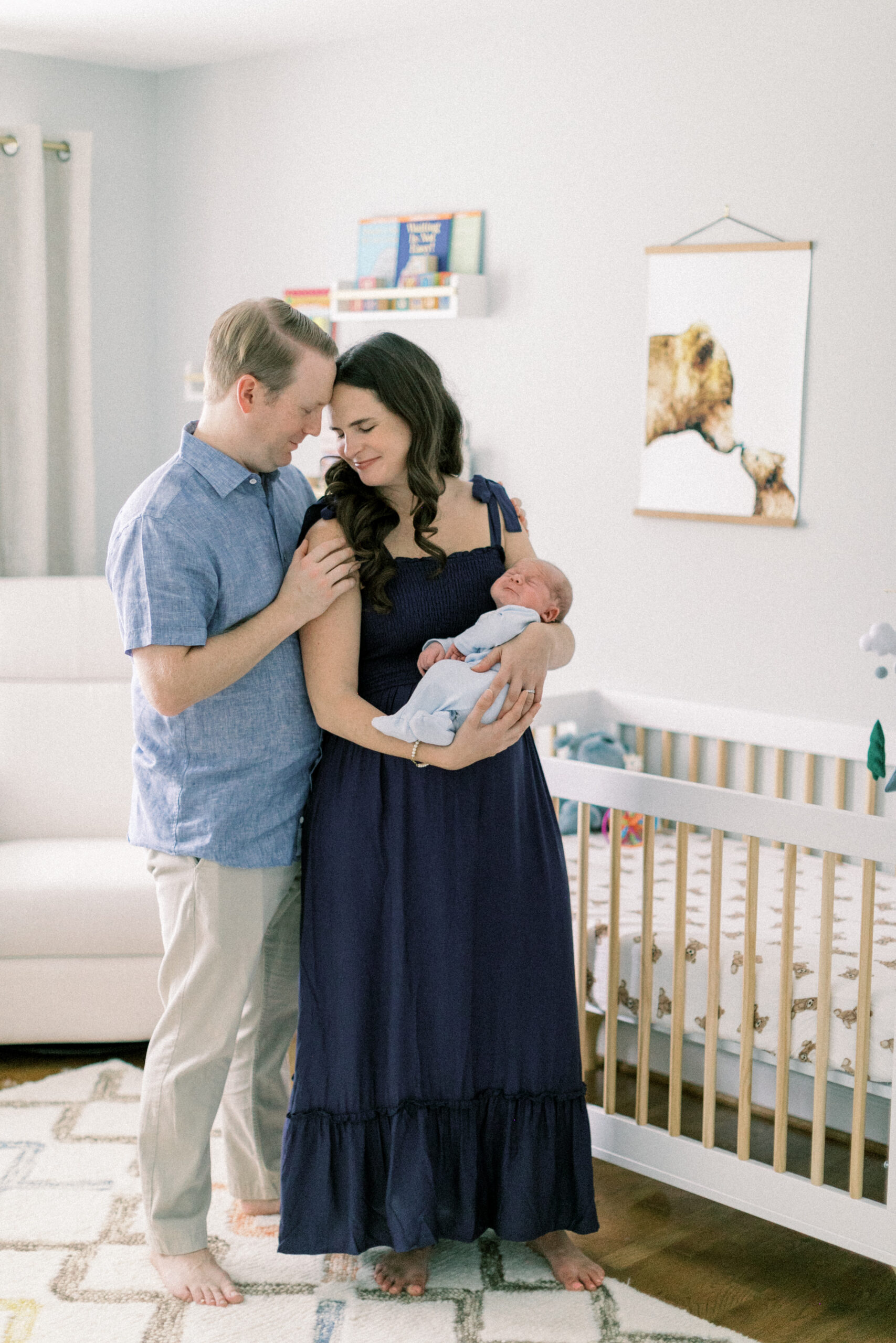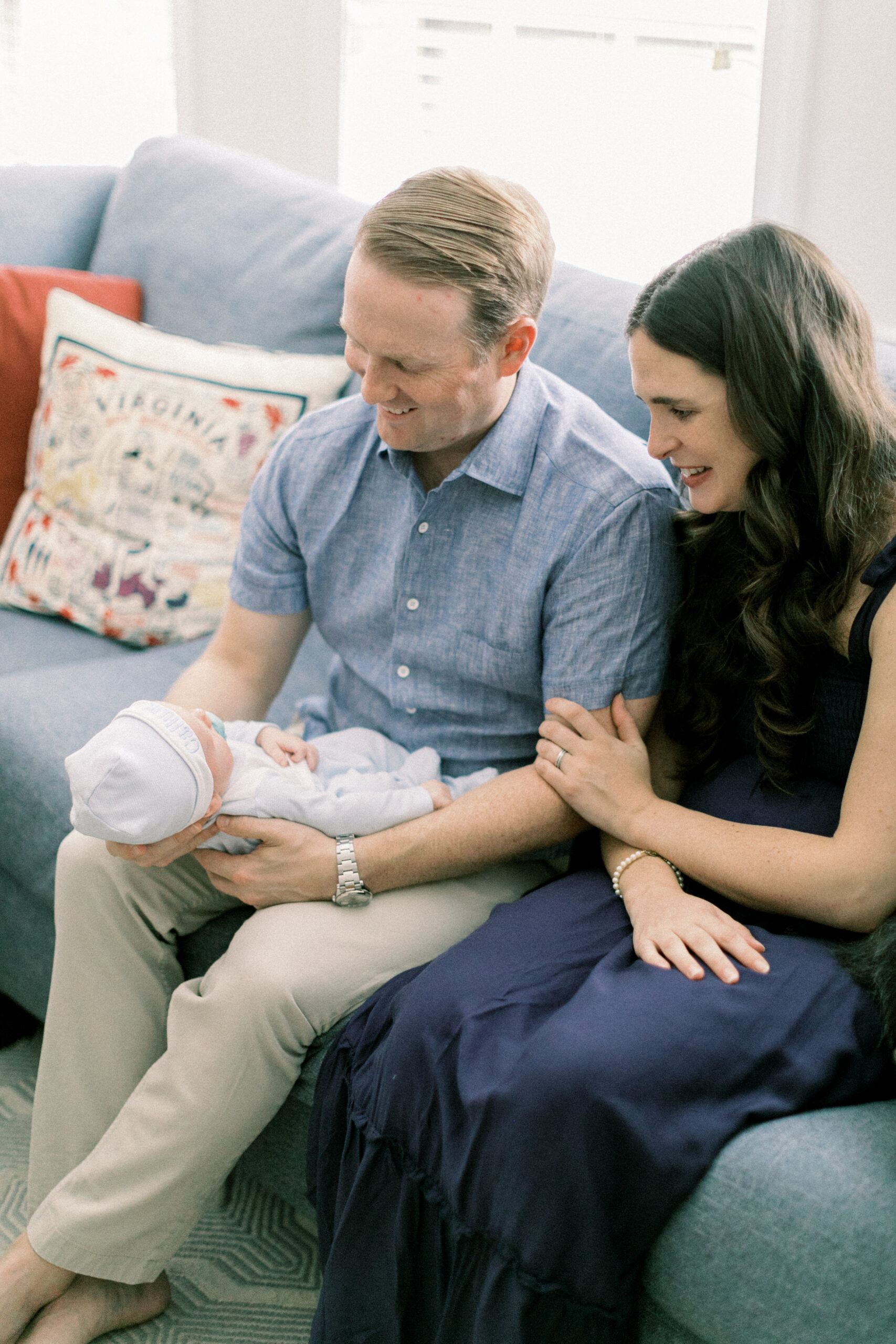 Newborn Portraits in Arlington, VA are always a special experience, but when I get to photograph a past wedding couple as they welcome their first child, it’s even more meaningful. Sally and Kevin, one of my wedding couples from a few years ago, naturally reached out to me and my team to capture this next beautiful milestone in their lives—the arrival of their sweet son, Cal. After he was born, my associate photographer, Sam, met them in their home to document all the love, joy, and newborn snuggles that filled their space.