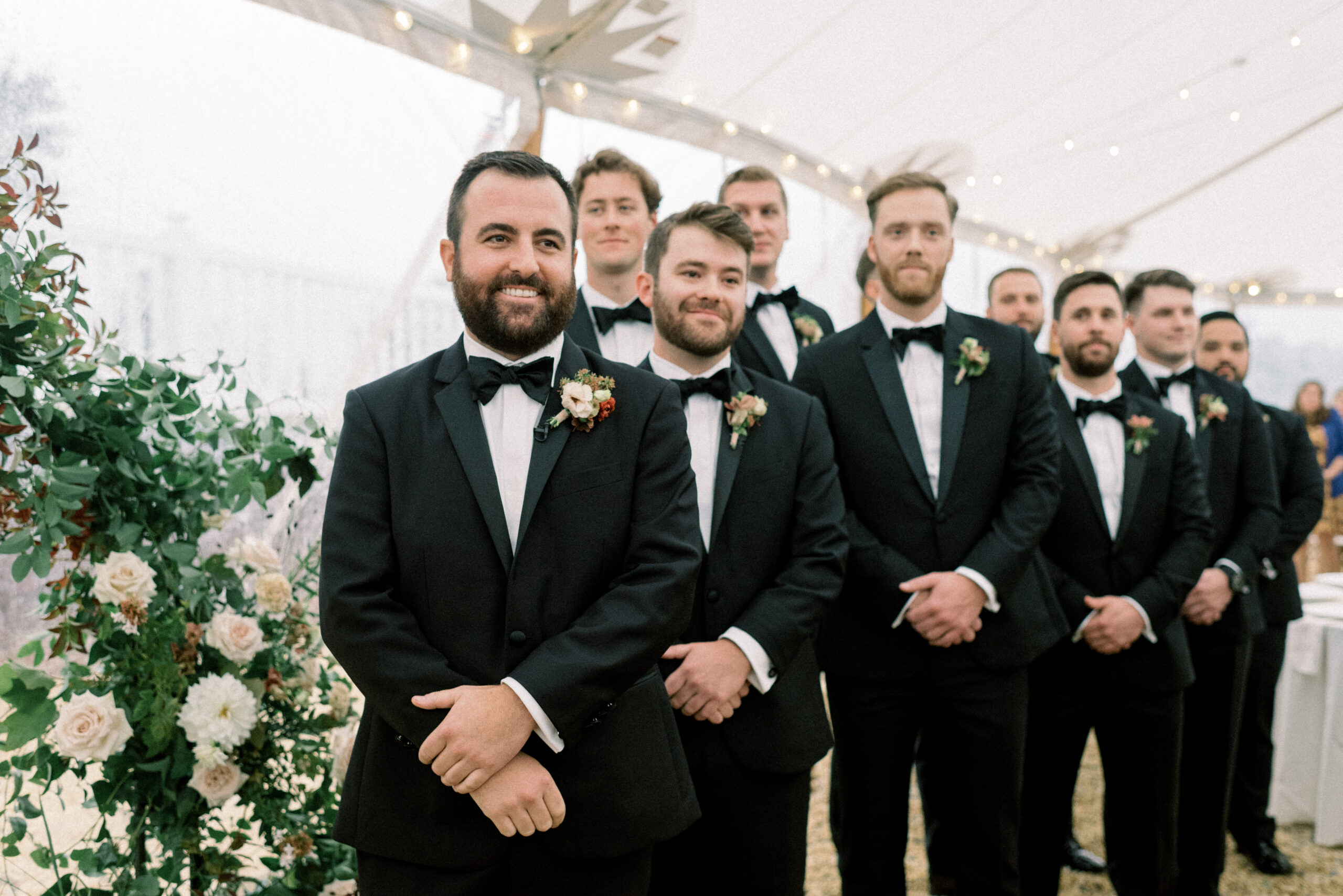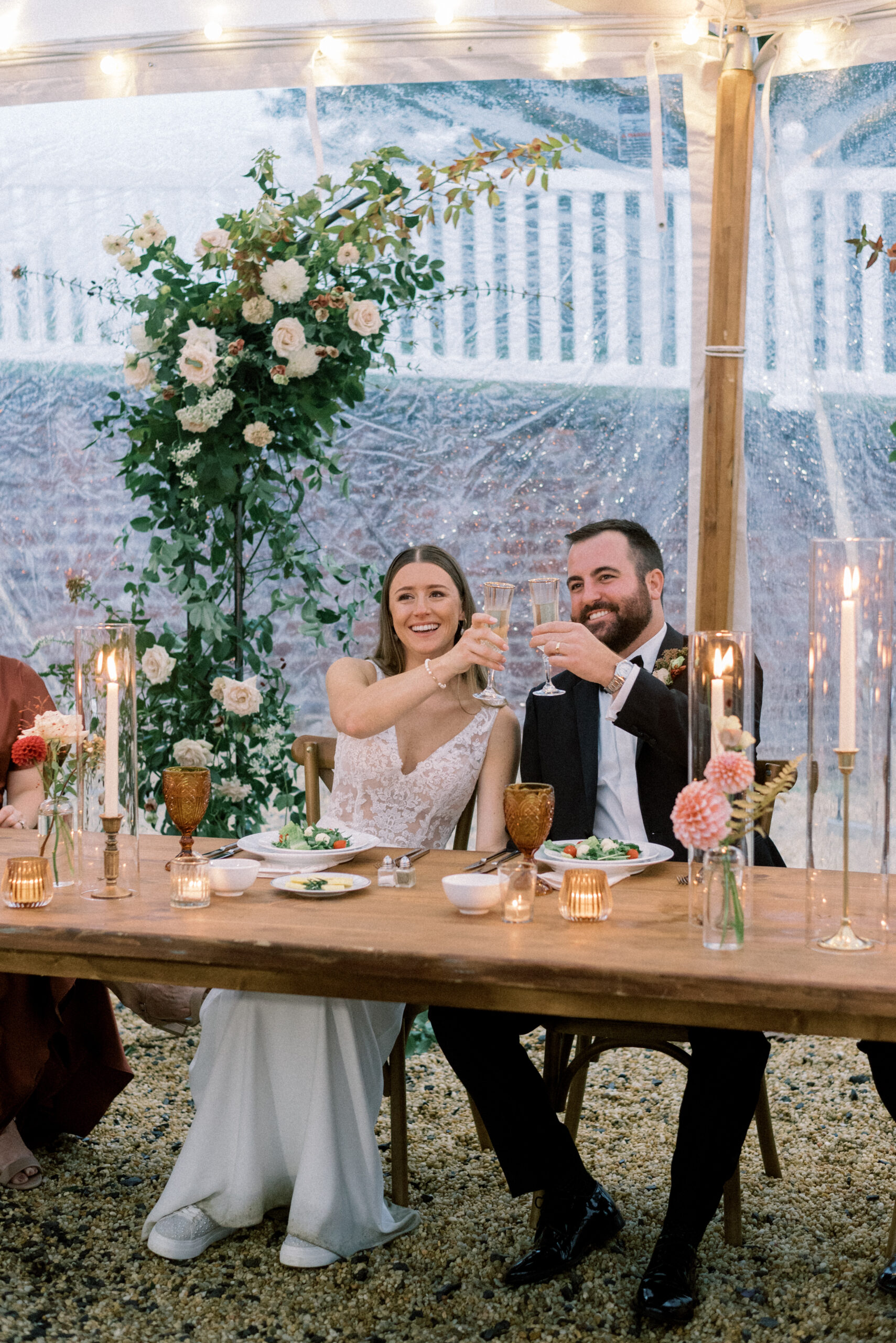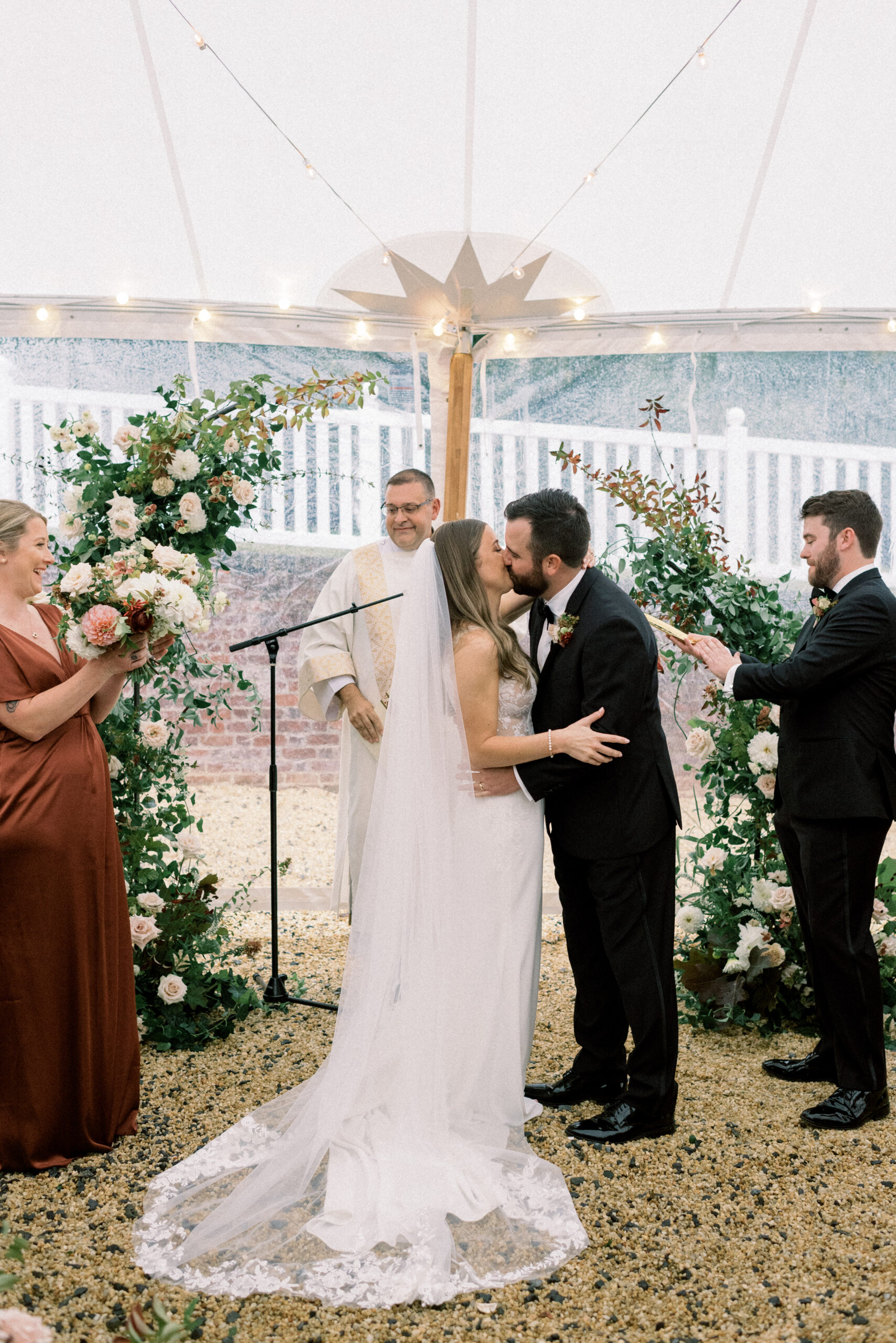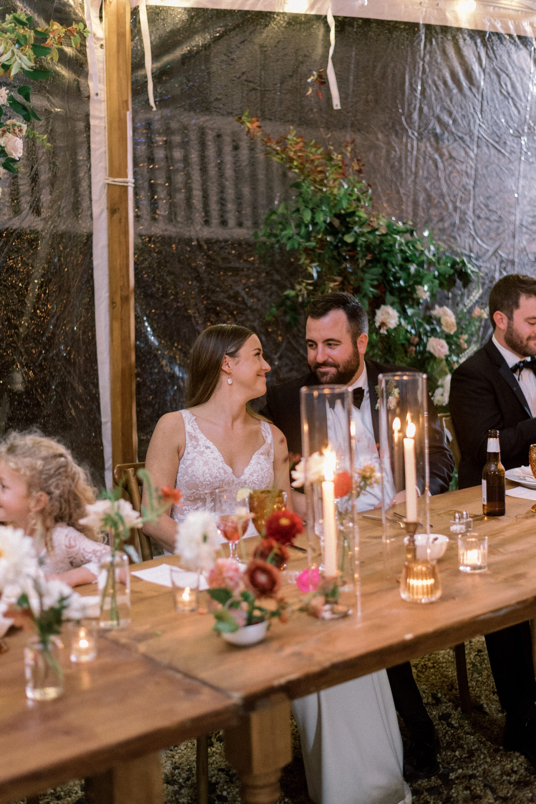 Kelsey and Kemp’s wedding day was graced with the gentle patter of rain, adding a unique charm to their ceremony. Beneath a cozy tent, the couple exchanged vows in the presence of their beloved friends and family. The rain drumming softly on the tent above created a serene and intimate atmosphere. Kemp’s touching words to the Deacon, “She always seems to love me selflessly, which inspires me to do the same,” resonated deeply with everyone present.
