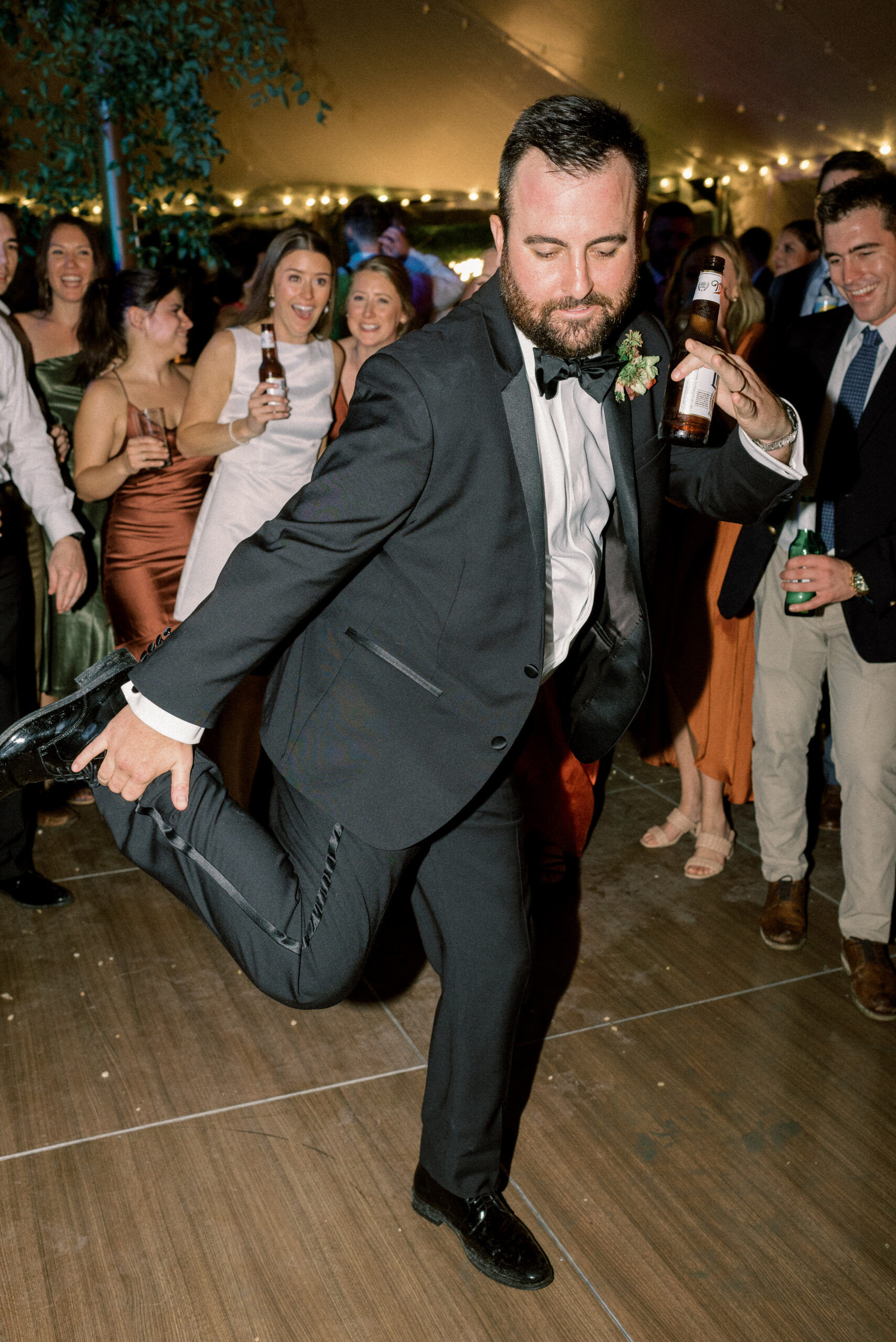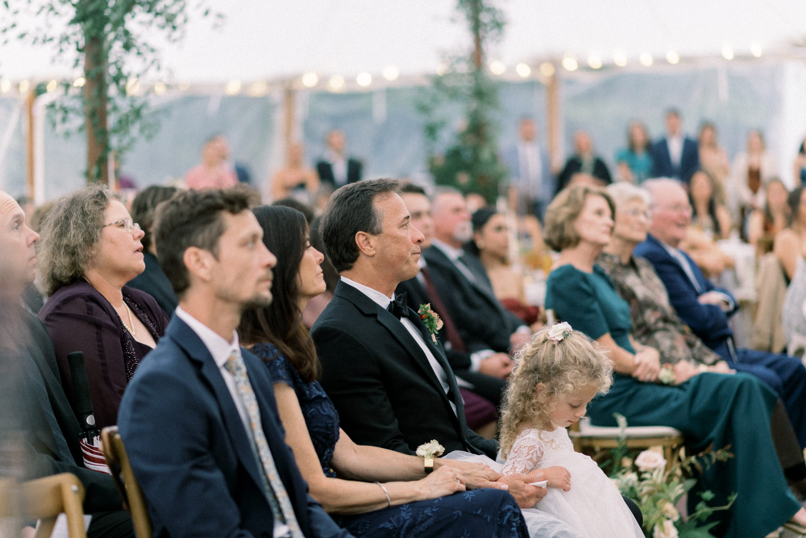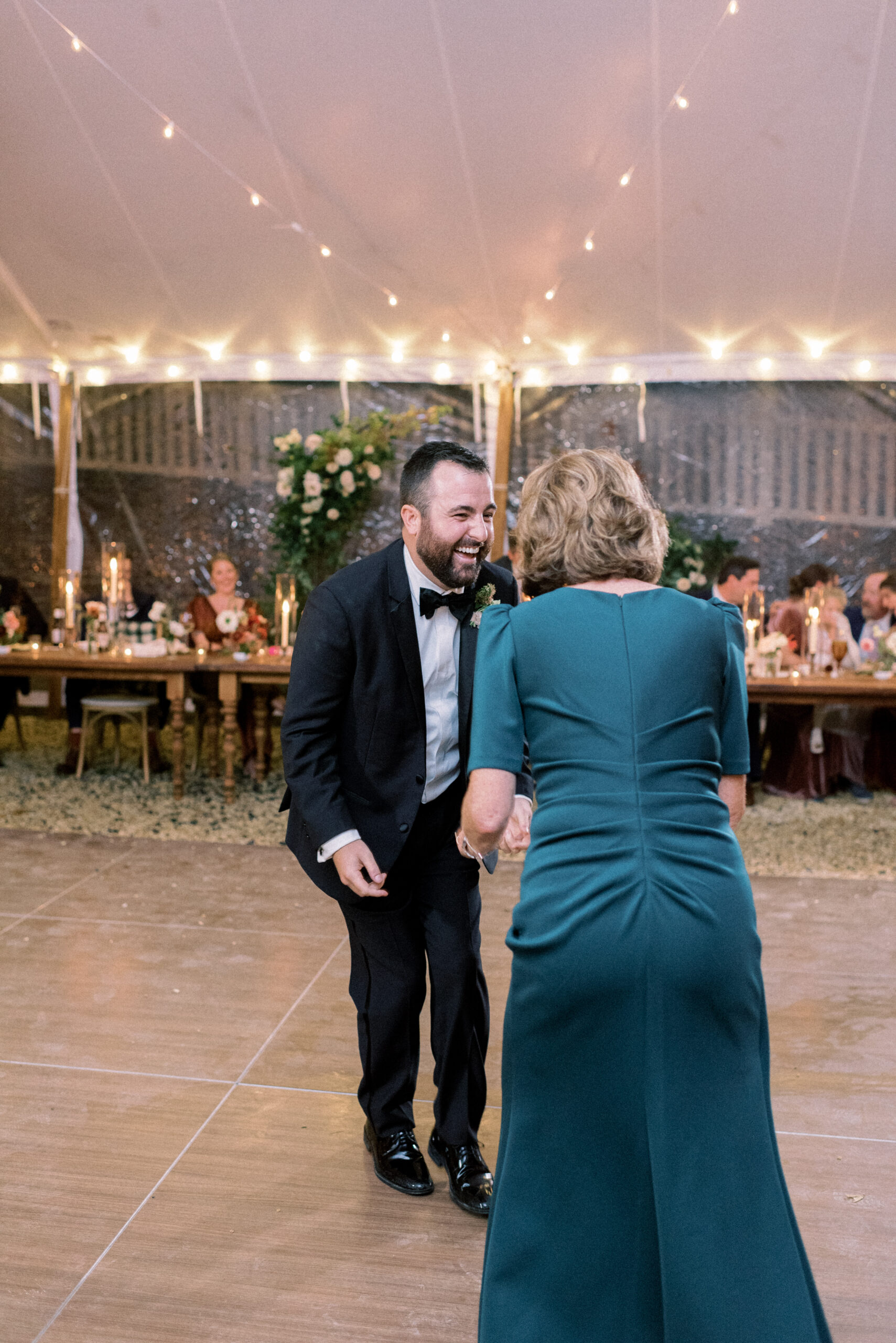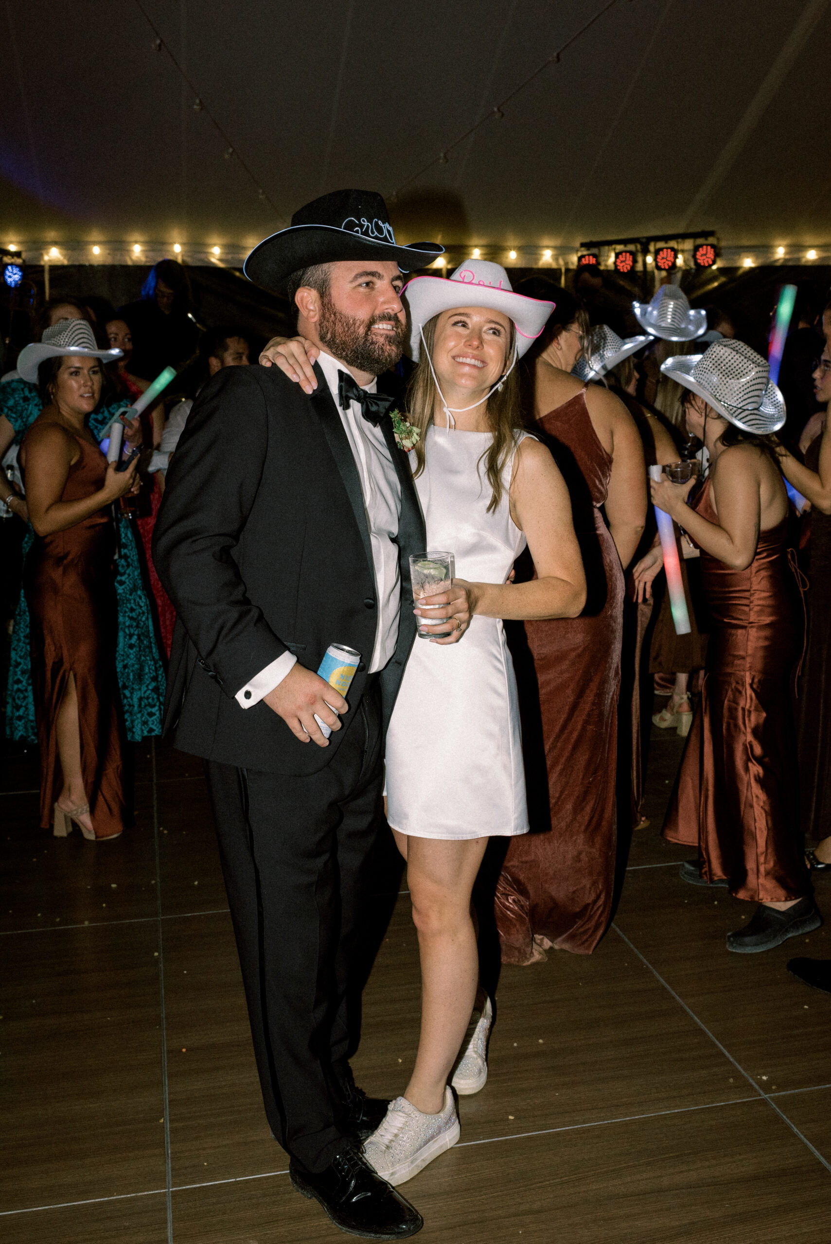 Kelsey and Kemp’s wedding day was graced with the gentle patter of rain, adding a unique charm to their ceremony. Beneath a cozy tent, the couple exchanged vows in the presence of their beloved friends and family. The rain drumming softly on the tent above created a serene and intimate atmosphere. Kemp’s touching words to the Deacon, “She always seems to love me selflessly, which inspires me to do the same,” resonated deeply with everyone present.
