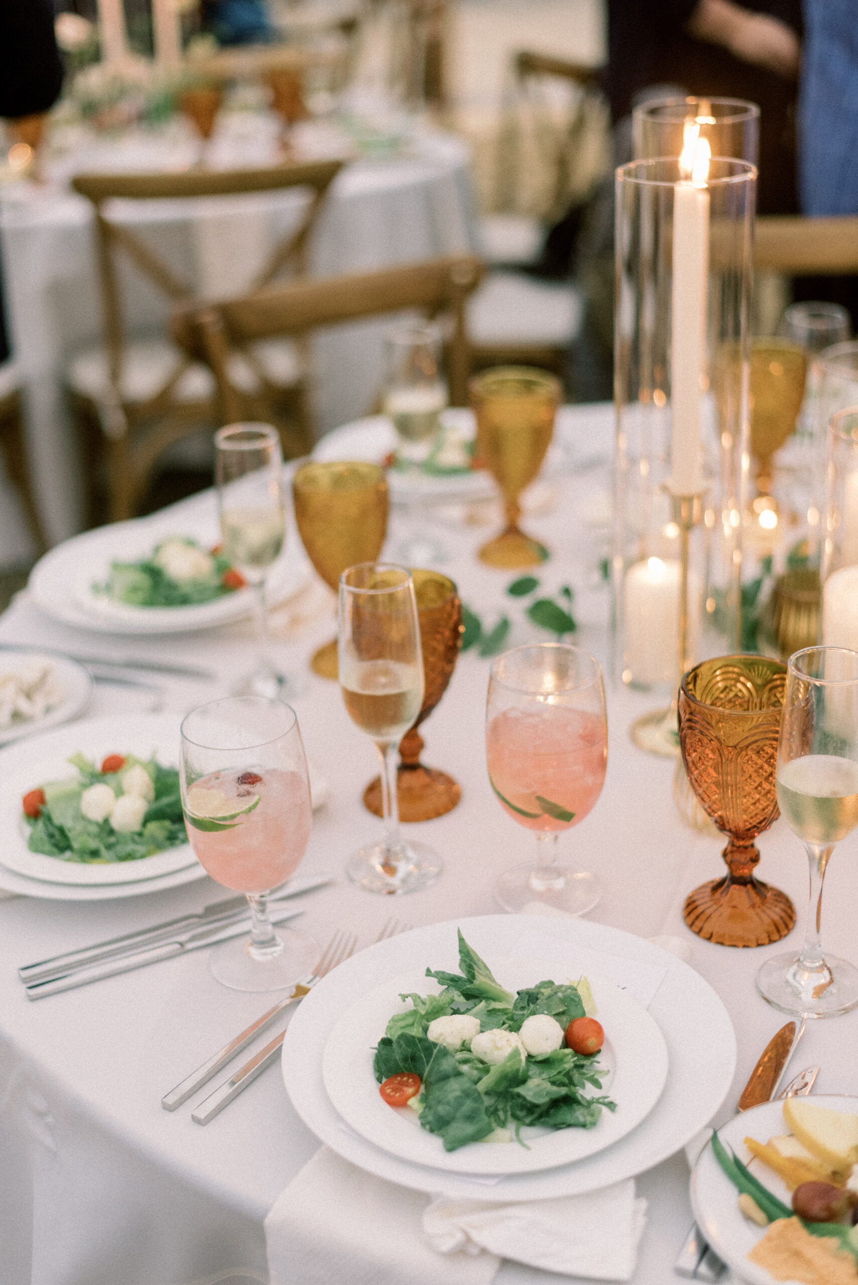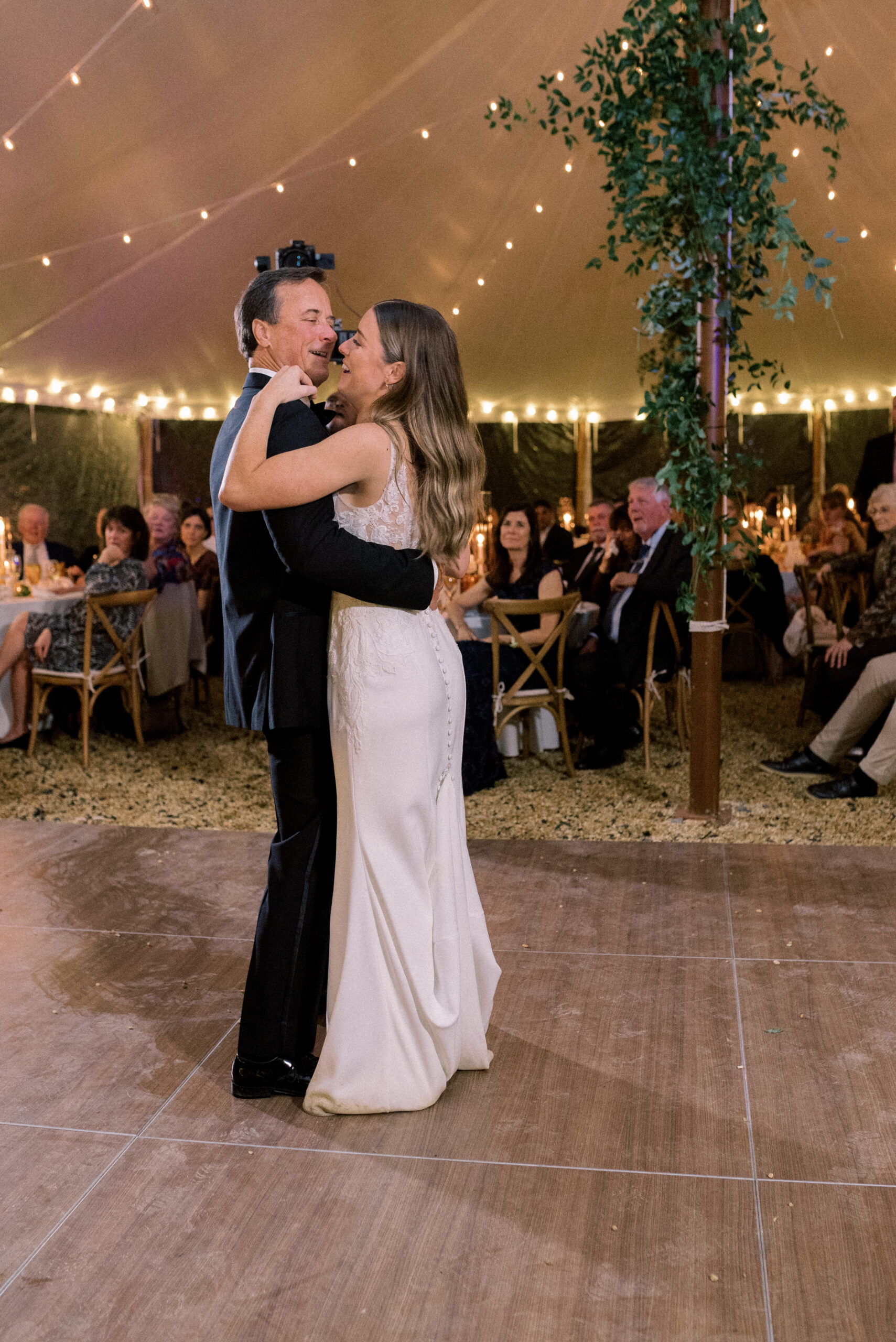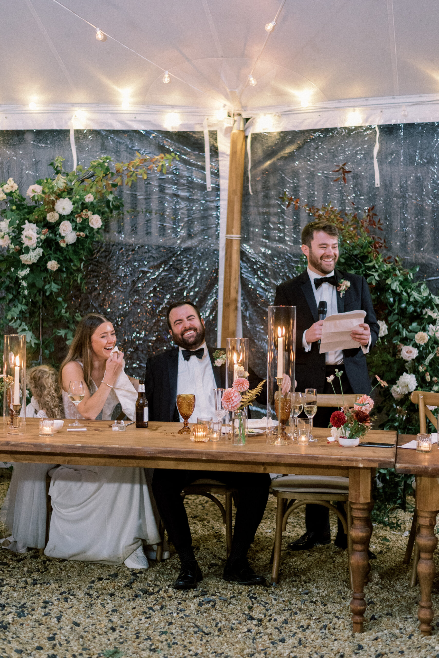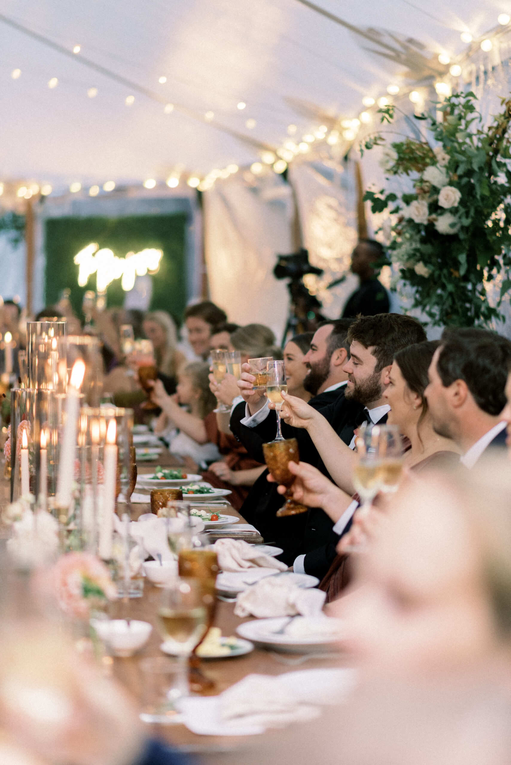 Following the ceremony, the celebration continued under a tent adorned with elegant string lights. The meticulous attention to detail was evident in every aspect of the reception, creating a sophisticated yet relaxed ambiance that perfectly matched the couple’s vision. The warmth and love shared among the guests made the evening truly magical.