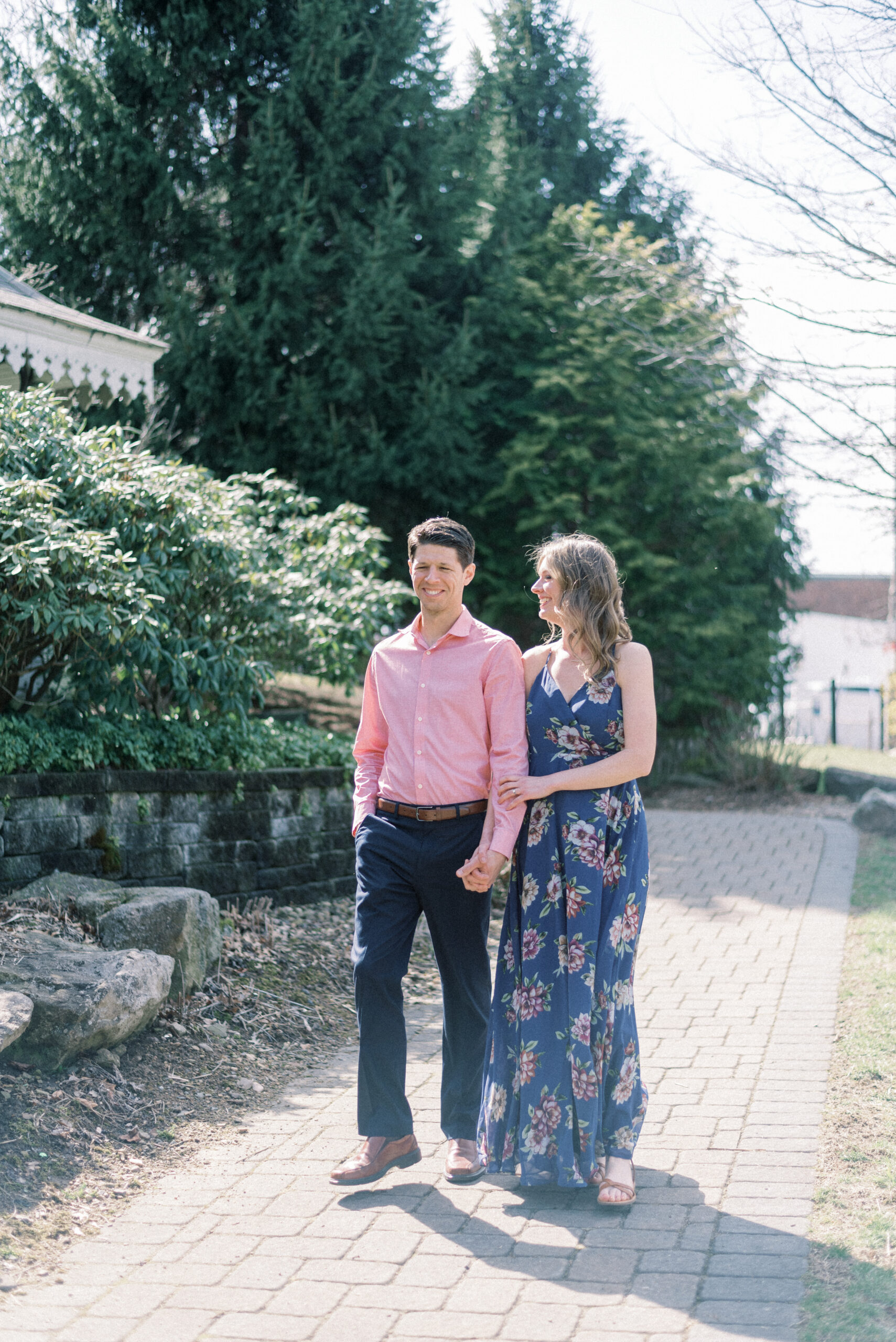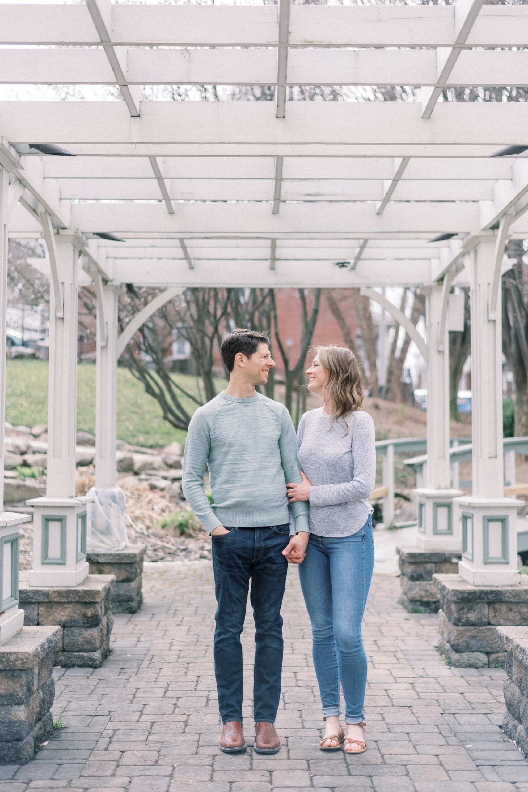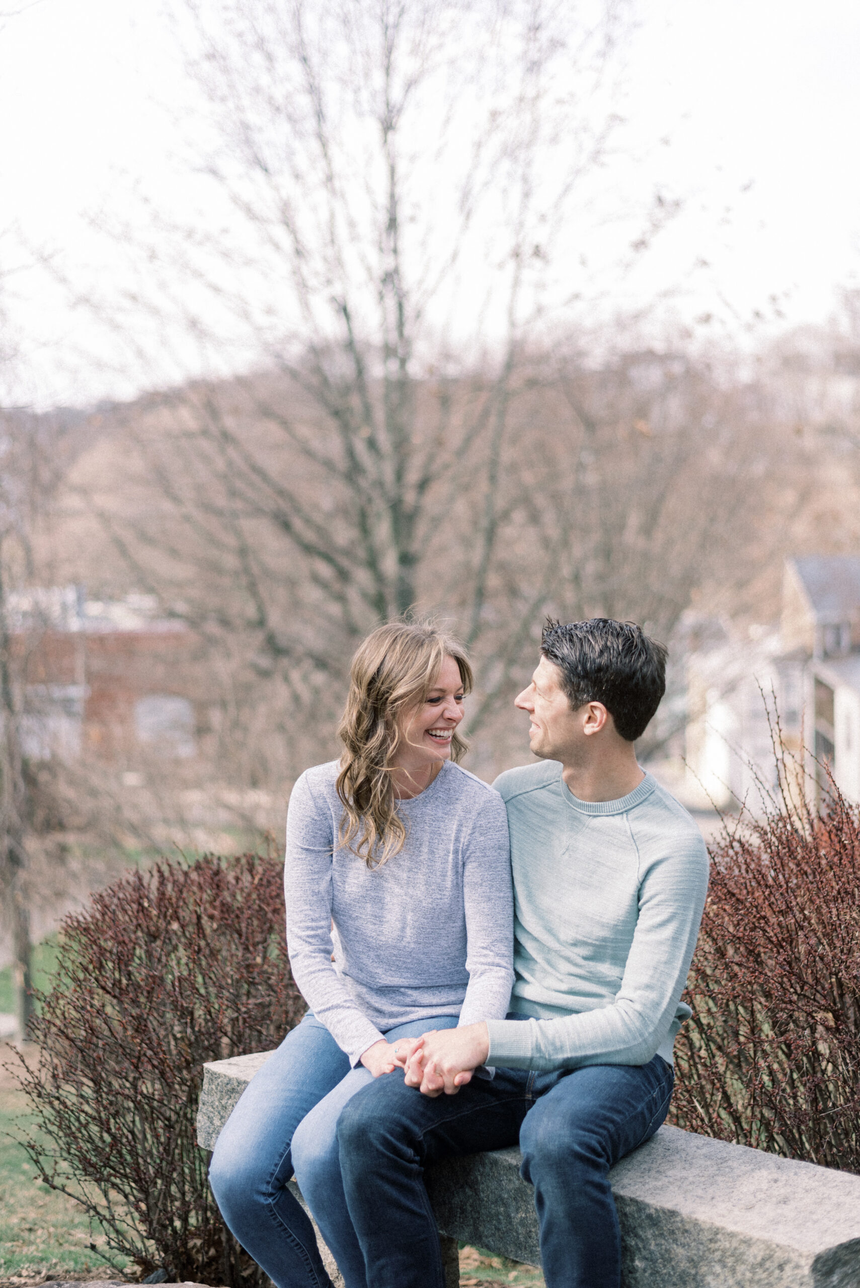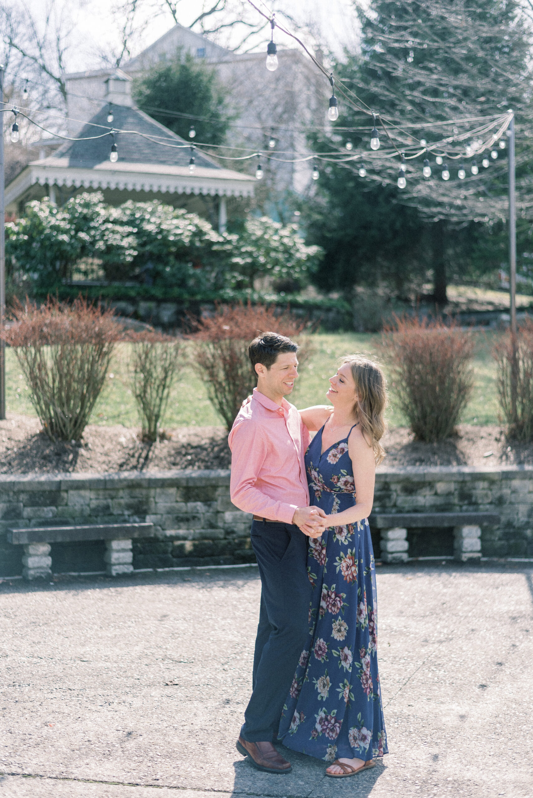 Andy knew for a long time that he wanted to marry Heather. On November 6th, they ran a 10k in the morning, then went to the Art Museum and ate Ethiopian food. Heather was pretty tired and suggested they go home to relax and put their feet up. It was unseasonably warm so Andy suggested they go get their favorite vegan ice cream, Milk Jawn and go to Lemon Hill, a section of Fairmount Park that overlooks the Art Museum and city skyline. Of course Heather said yes to that! They were having a nice romantic evening when Andy pulled out a ring and asked, “Will you marry me?” To which Heather responded, “Is this for real!?” And it was! Andy had picked out the ring on his own, inspired by the two rings that Heather wore every day. Because surprising Heather was the priority, Andy hadn’t gotten her ring size and made a guess based on her shoe size and height. It was only three sizes off 😉 But it was perfect! I met the two of them for their Yuengling Bicentennial Park Engagement Portraits on what was forecasted to a rain covered day. Thankfully the rain took a break and the sun came out instead.